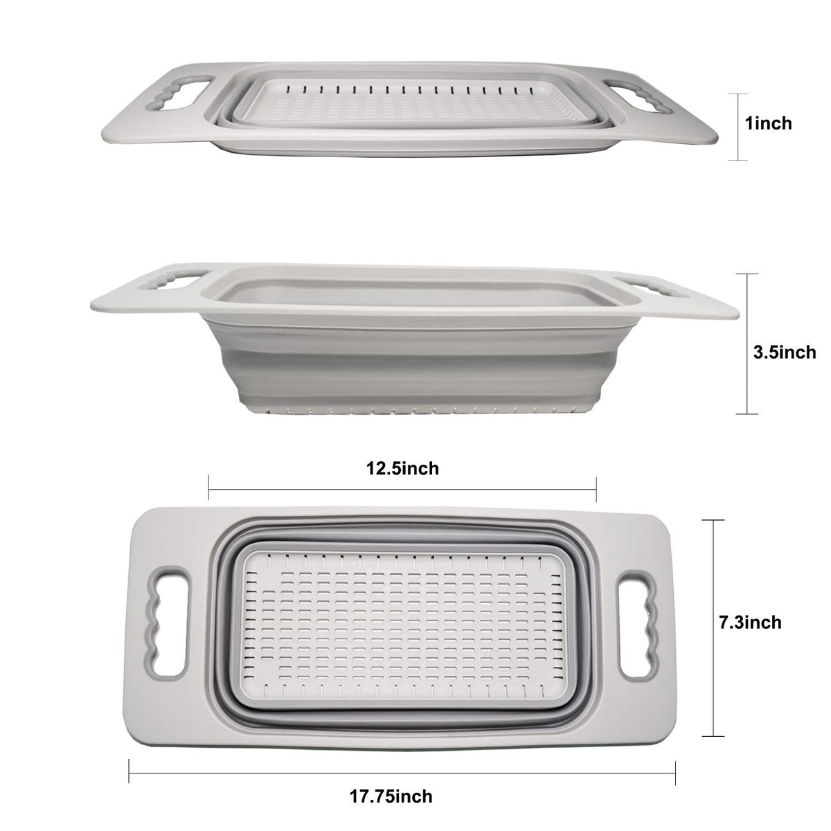 • Q: What are the dimensions of the SAMMART Over The Sink Rectangular Colander? A: The expanded size of the SAMMART colander is 17.75 inches long, 7.25 inches wide, and 3.5 inches high. When collapsed, it has a height of just 1 inch.