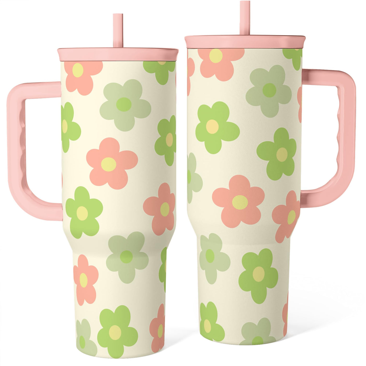 SANDJEST Daisy Tumbler with Handle 40oz, Floral Cup Stainless Steel Insulated Tumblers Coffee Travel Mug with Straw, Flower Cups