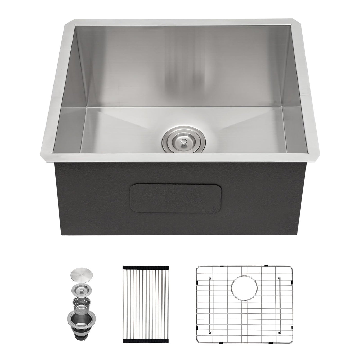 • Q: Does the sink come with installation hardware? A: Yes, the sink package includes installation hardware, a roll-up drying rack, drain strainer, bottom rinse grid, and installation instructions.