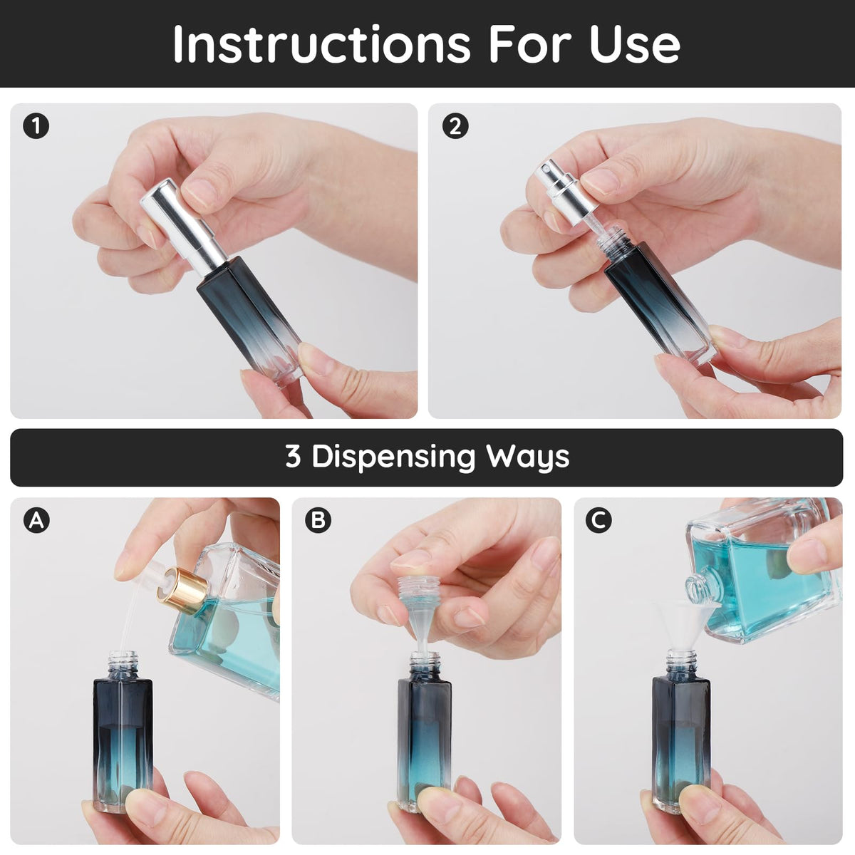 - Q: How do I refill the perfume atomizers? A: Refilling is easy with the included funnel, dropper, and pump, allowing you to dispense liquid into the atomizer without mess.