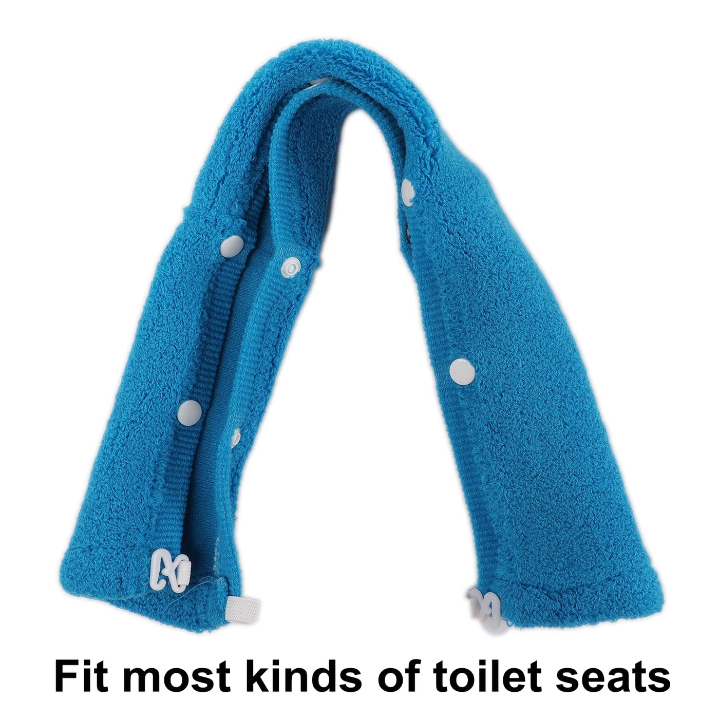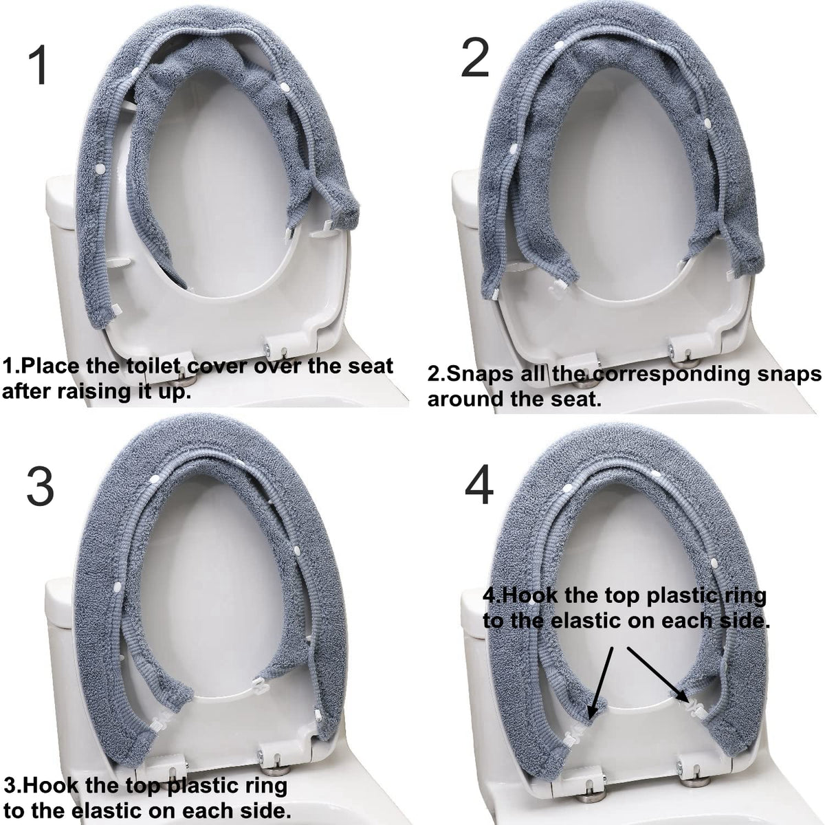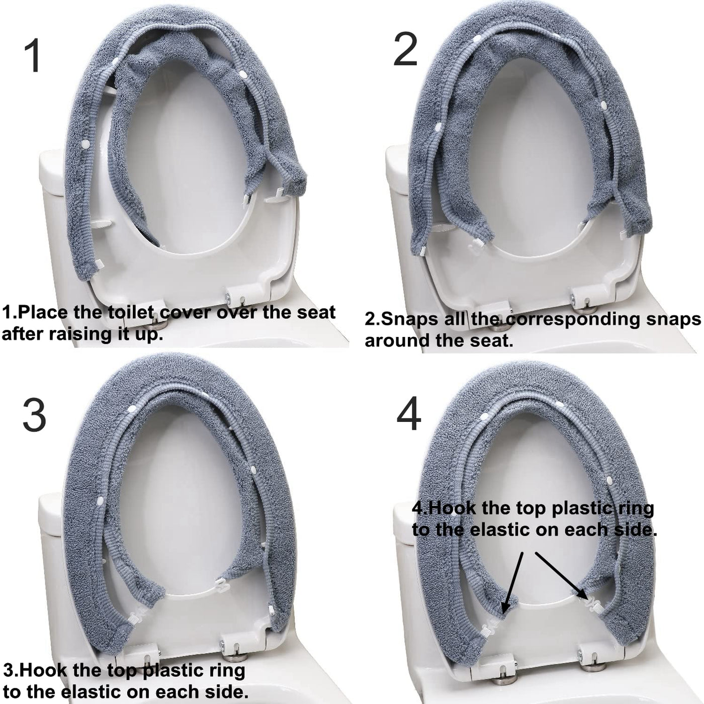 • Q: Is the toilet seat cover easy to install? A: Yes, the toilet seat cover is easy to install. Simply place it over the seat, snap the corresponding snaps around the seat, hook the top plastic ring to the elastic on each side, and make any necessary adjustments.