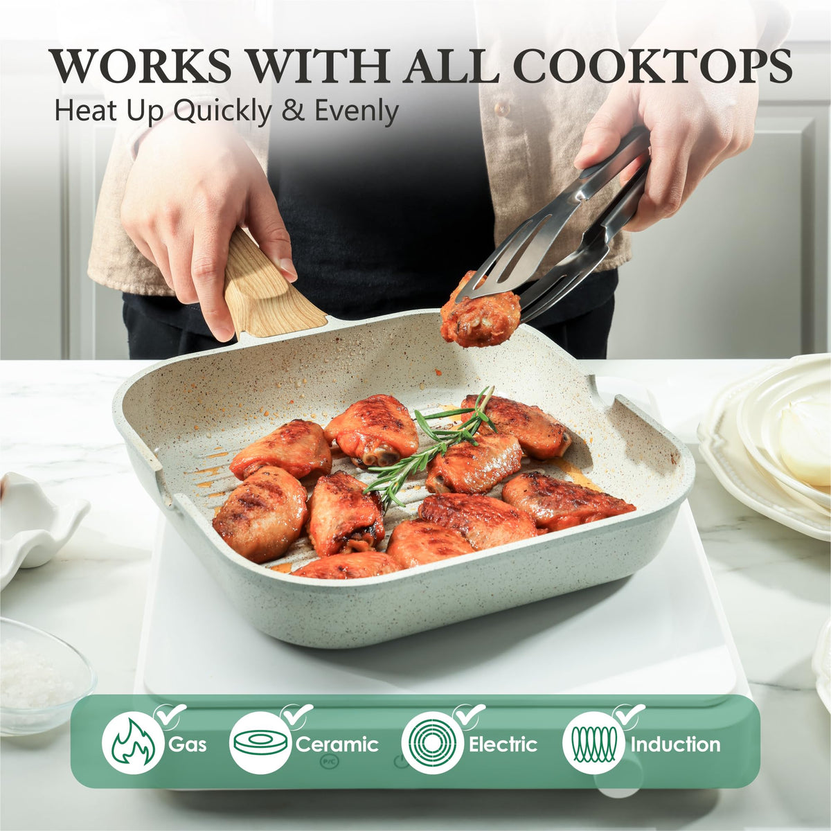 Sensarte Nonstick Ceramic Grill Pan For Stove Tops, Versatile Square Grilling Pan With Pour Spouts, Durable Grill Skillet For Al