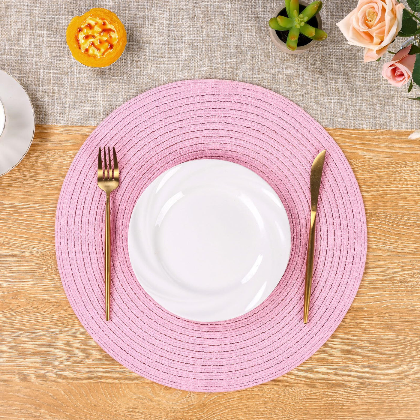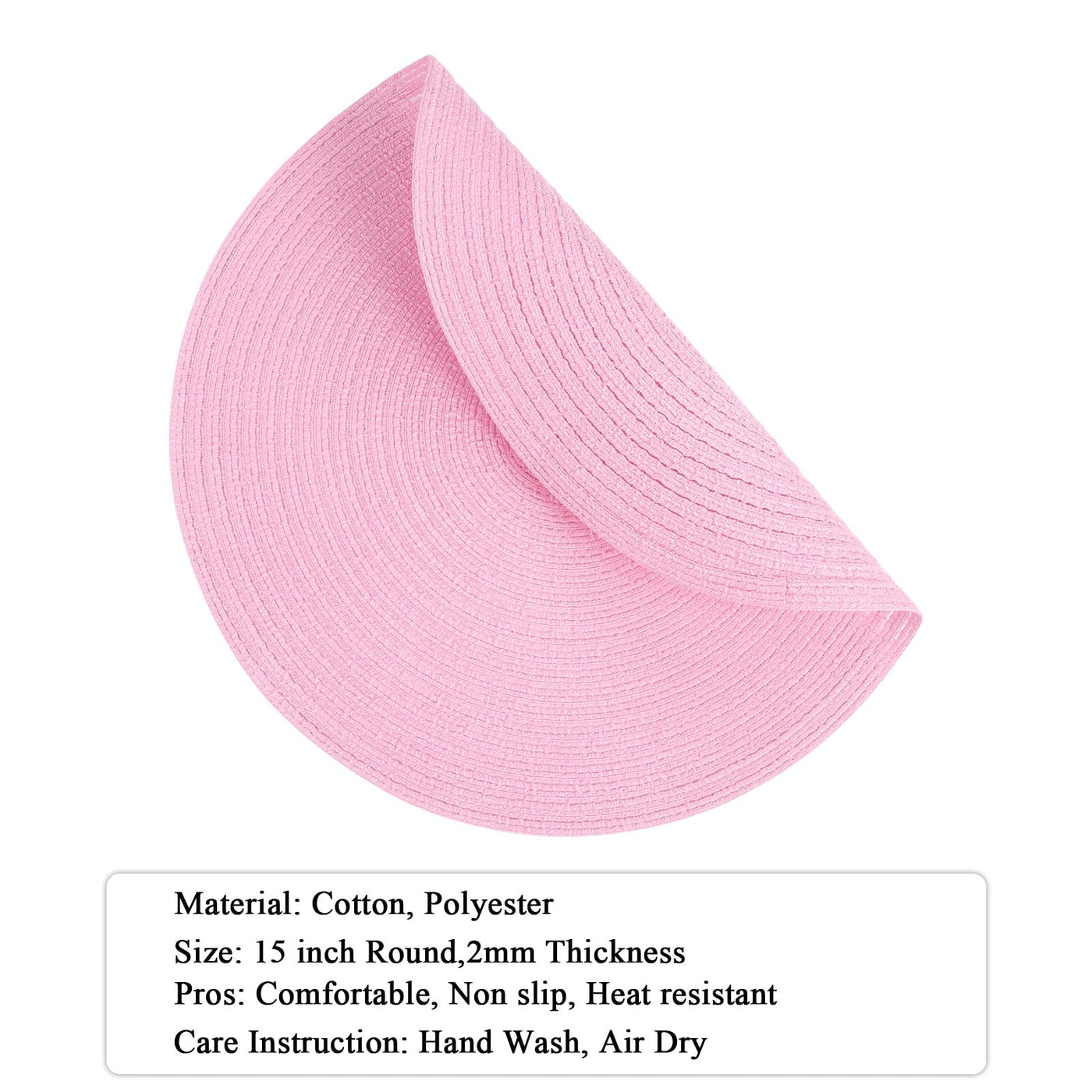 • Q: What size are the placemats? A: Each placemat measures approximately 15 inches or 38 centimeters in diameter, making them suitable for various table settings.