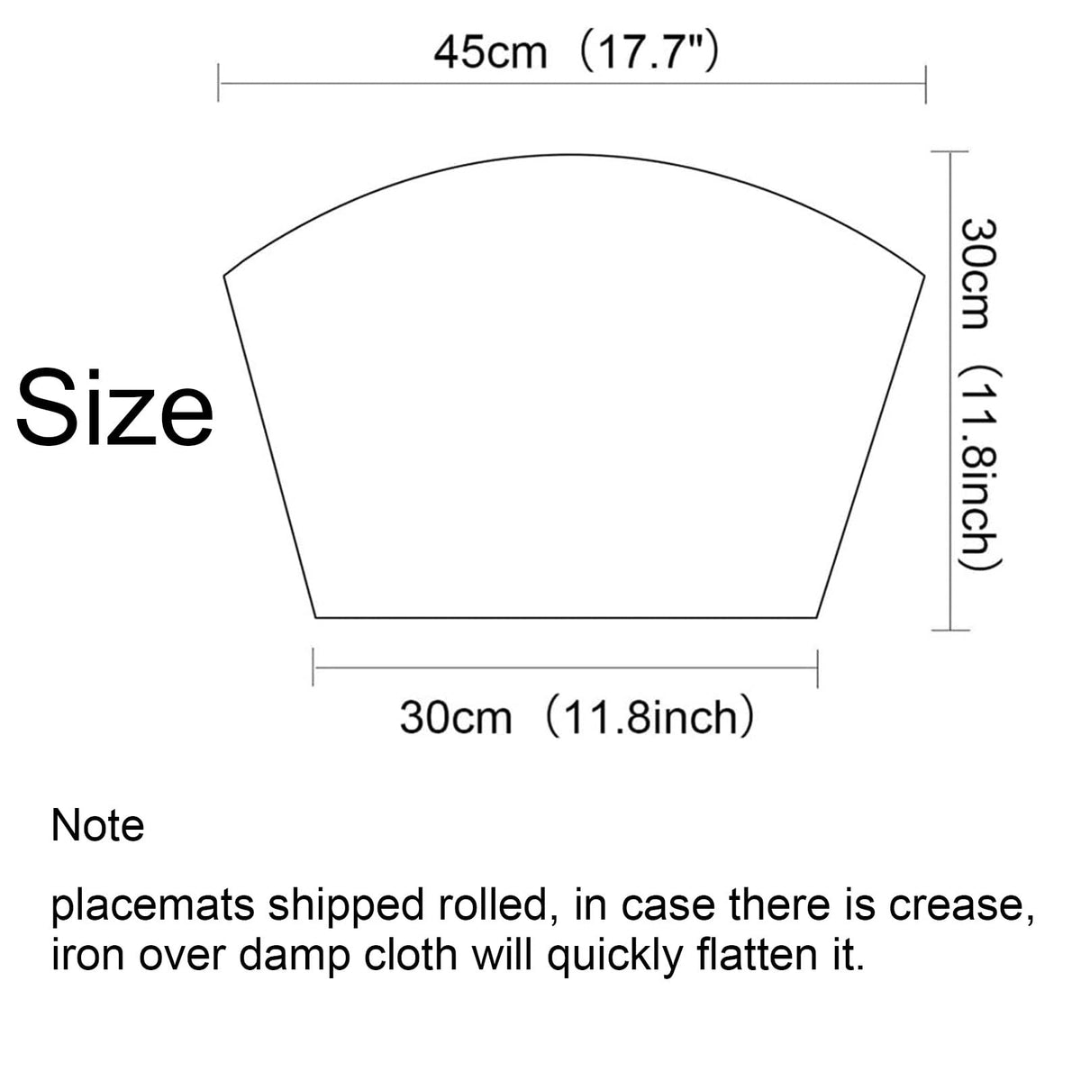 • Q: What sizes do the placemats measure? A: Each placemat measures approximately 12 inches in upper width, 18 inches in lower width, and 12 inches in height.
