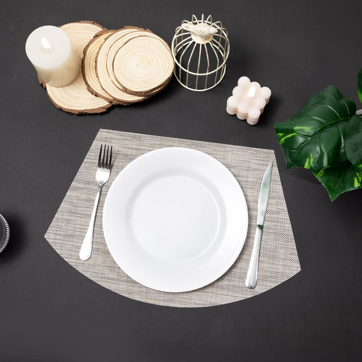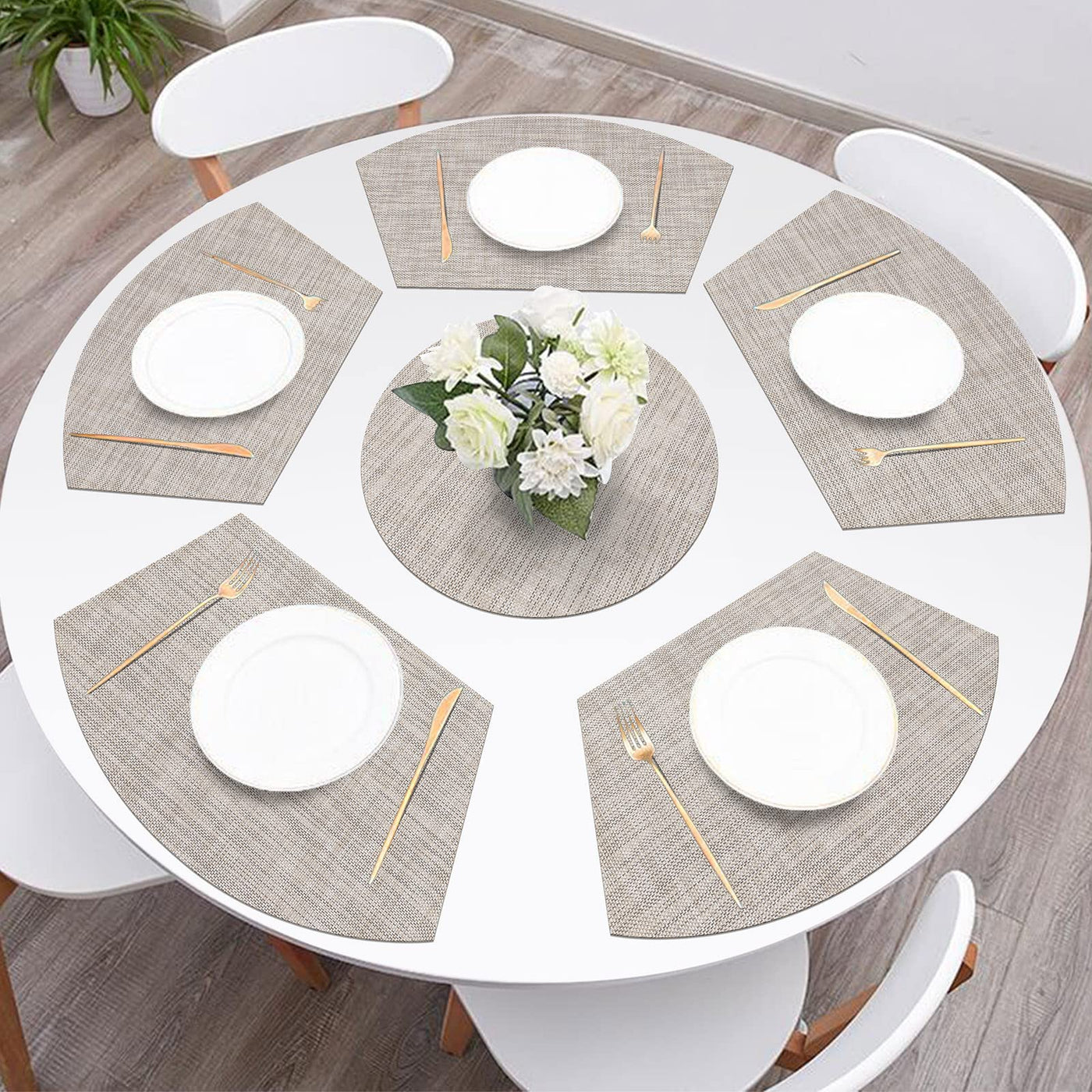 • Q: How many placemats are included in the set? A: The set includes a total of 7 placemats, consisting of 6 wedge-shaped placemats and 1 round centerpiece mat.