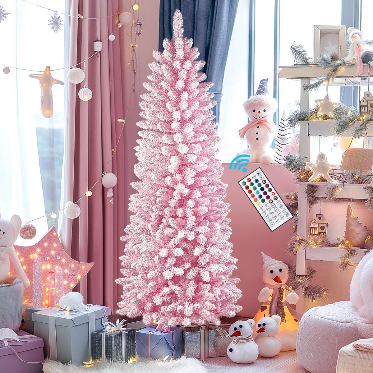 SHareconn 6.5ft Prelit Snow Flocked Artificial Hinged Slim Pencil Christmas Tree, with Remote Controlled Multi-Color RGB Lights, Good Choice Decoration for Xmas Holiday, 6.5 FT, Flocked Pink