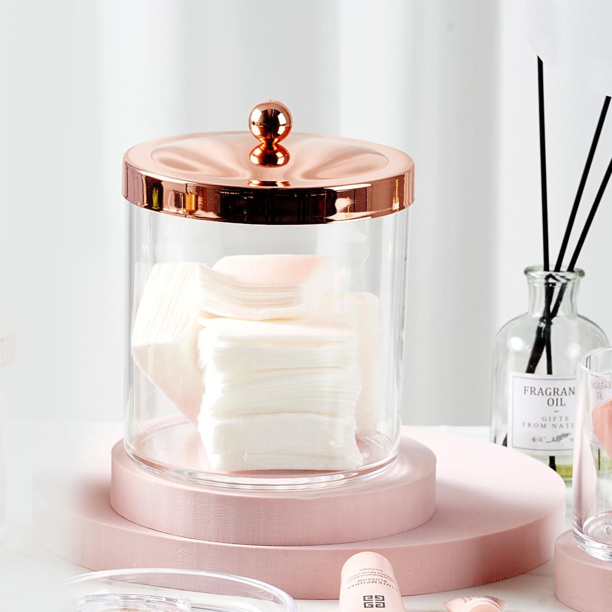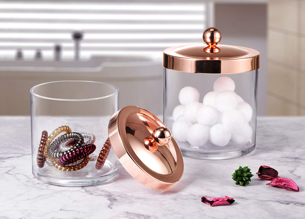 - Q: What types of items can be stored in these jars? A: These jars are perfect for storing cotton balls, cotton swabs, makeup sponges, hair accessories, guest soaps, and more.
