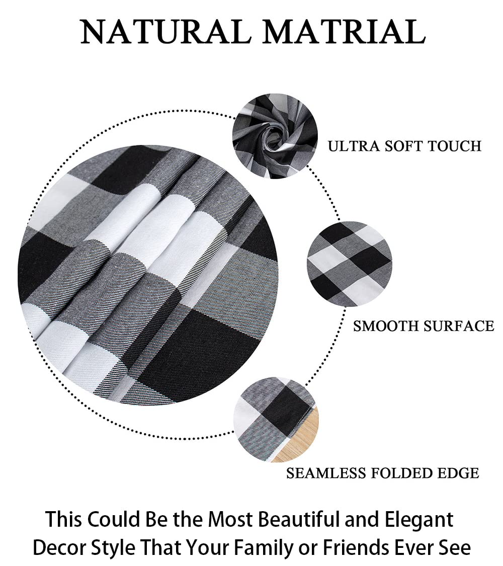 - Q: What features make this tablecloth a good choice for events? A: The tablecloth features a classic buffalo plaid design that is stylish and timeless, along with a folded border and fine stitching for an elegant look without loose threads.