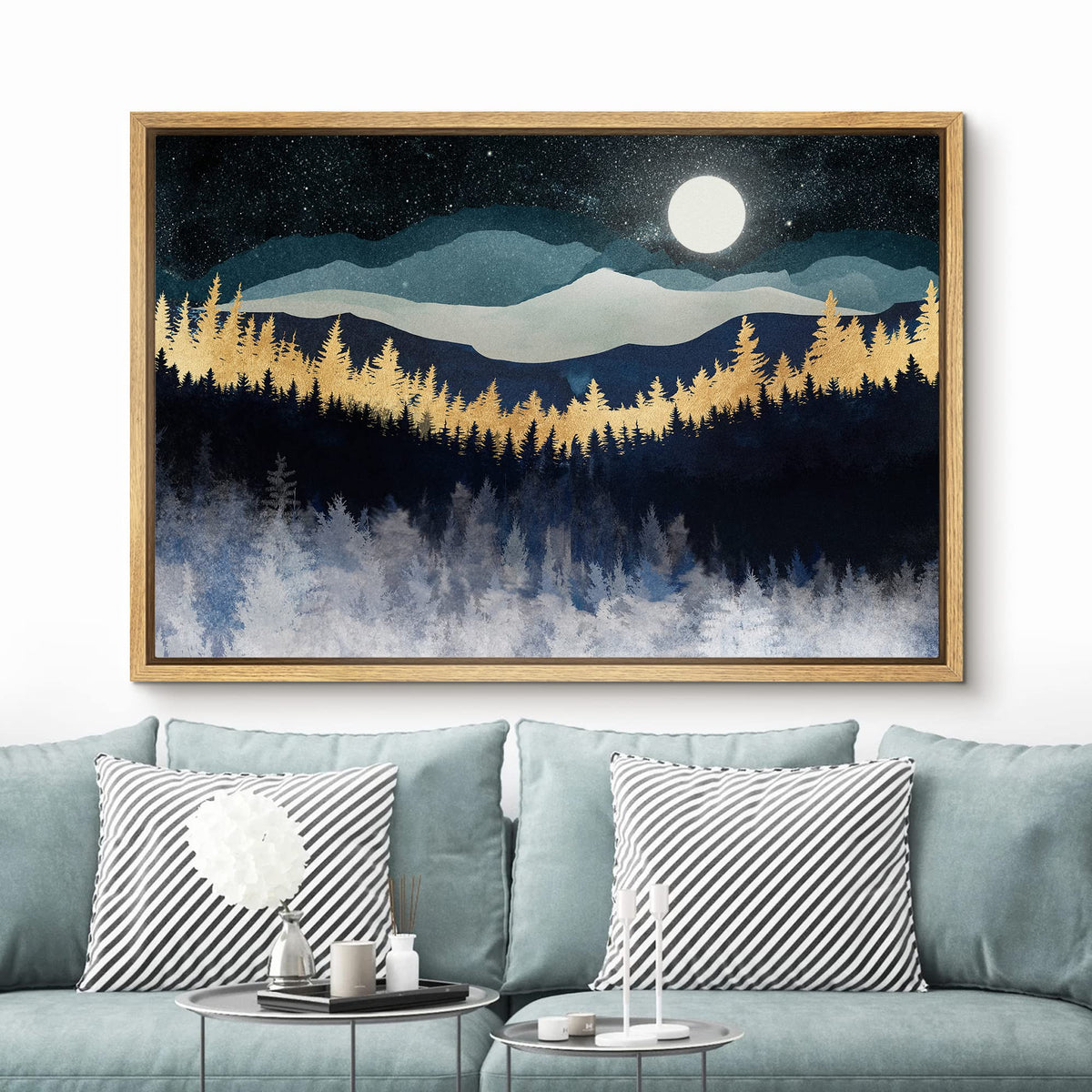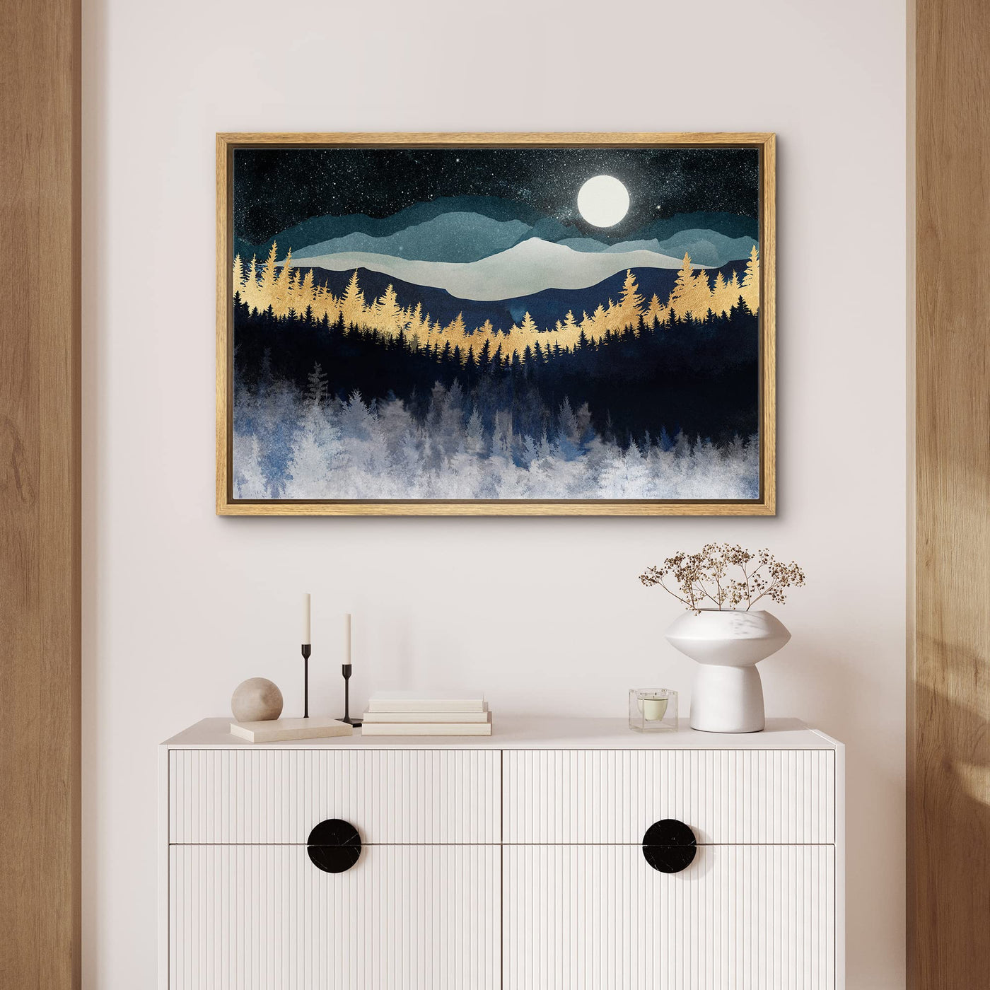 Signford Framed Canvas Print Wall Art Gold Blue Moonlight Mountain Forest Nature Wilderness Illustrations Modern Art Rustic Zen