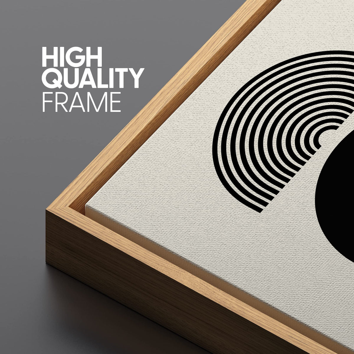 • Q: What is the overall theme of the artwork? A: The SIGNLEADER Framed Canvas Print features solid and spiral semi-circles in a geometric design, presented in modern black and white.