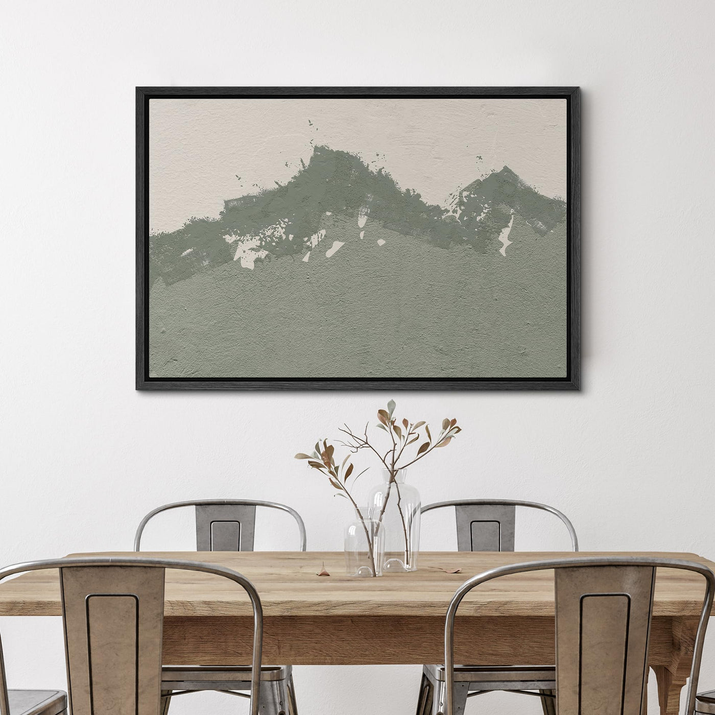 - Q: What kind of artwork is featured in this print? A: The SIGNWIN Framed Canvas Print features a dark duotone gray mountain range abstract design, embodying a mid-century minimalist geometric style.