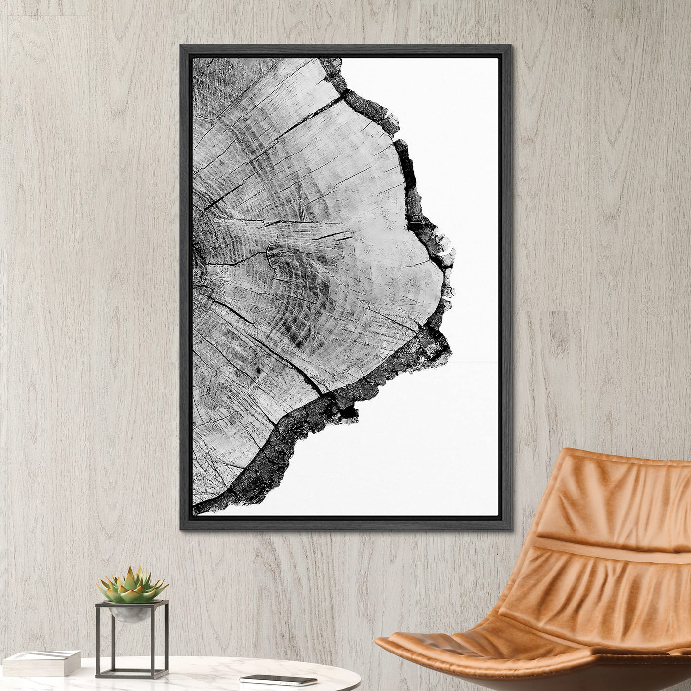 - Q: What type of artwork is featured on the canvas? A: The artwork features detailed wood rings of a tree, showcasing nature wilderness photography in a rustic, dramatic grey, black, and white style.