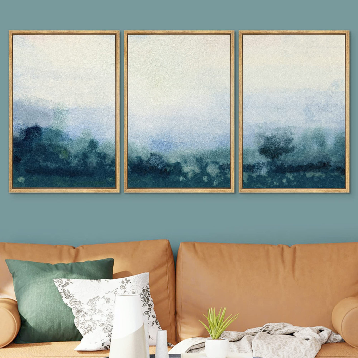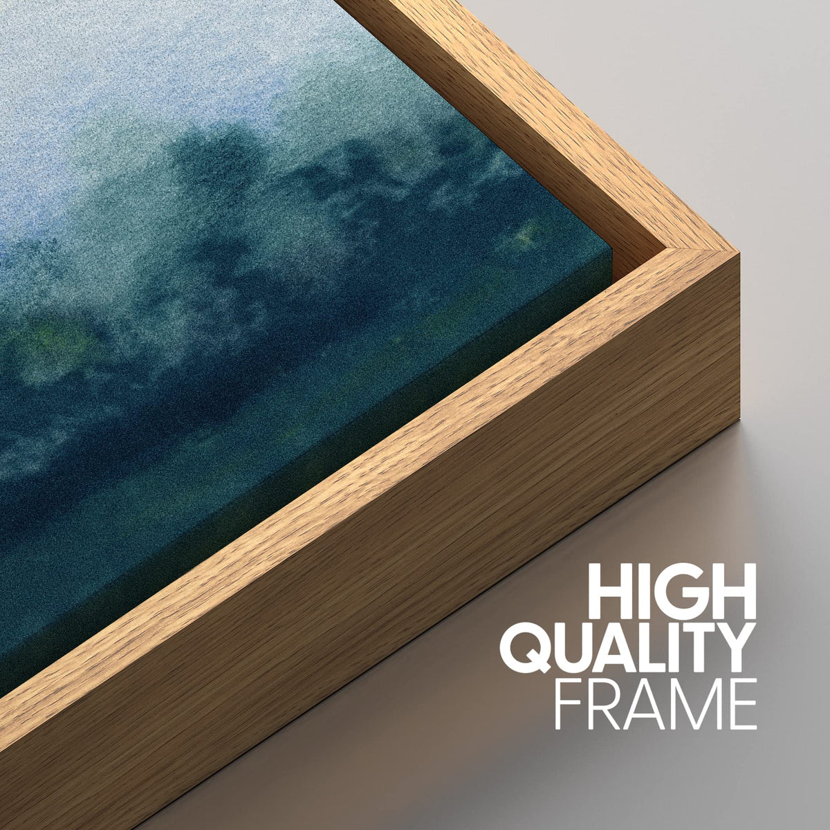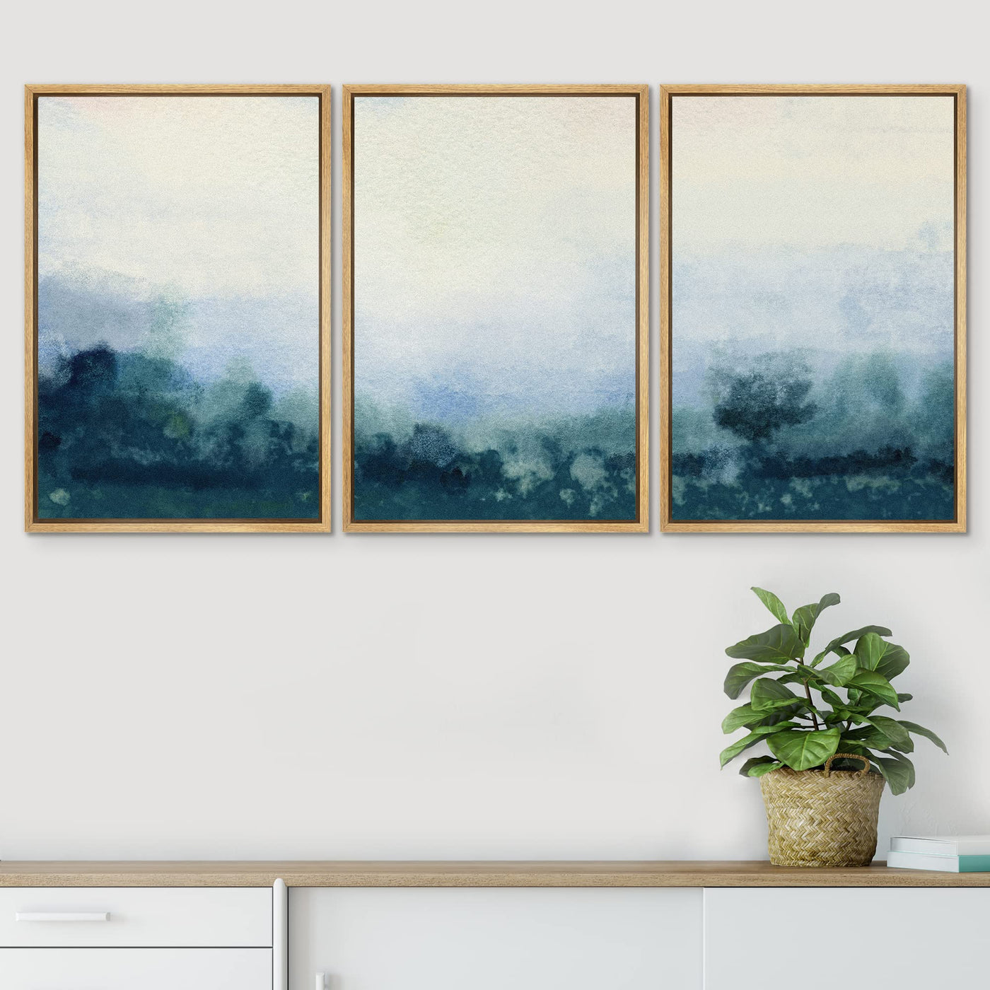 - Q: What type of artwork is featured on the SIGNWIN Framed Canvas Print? A: The print features a pastel blue minimal paint stroke landscape with abstract shapes, designed to create a calming atmosphere.