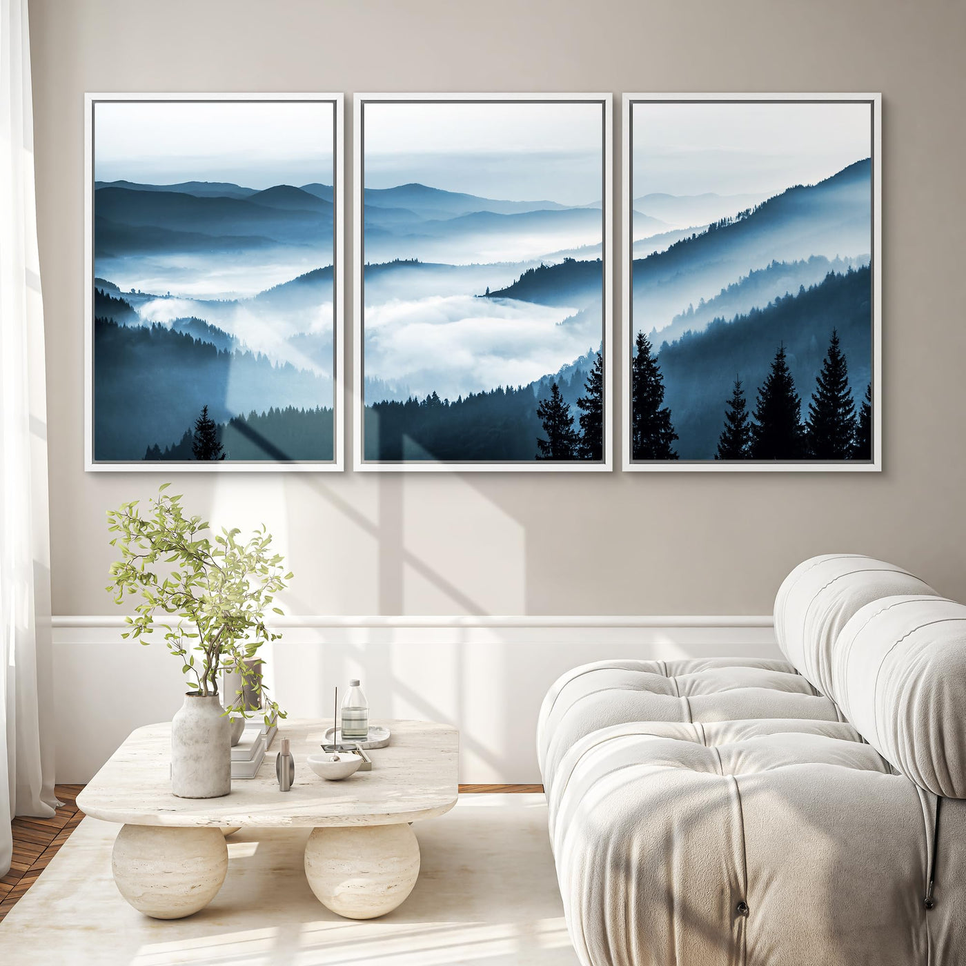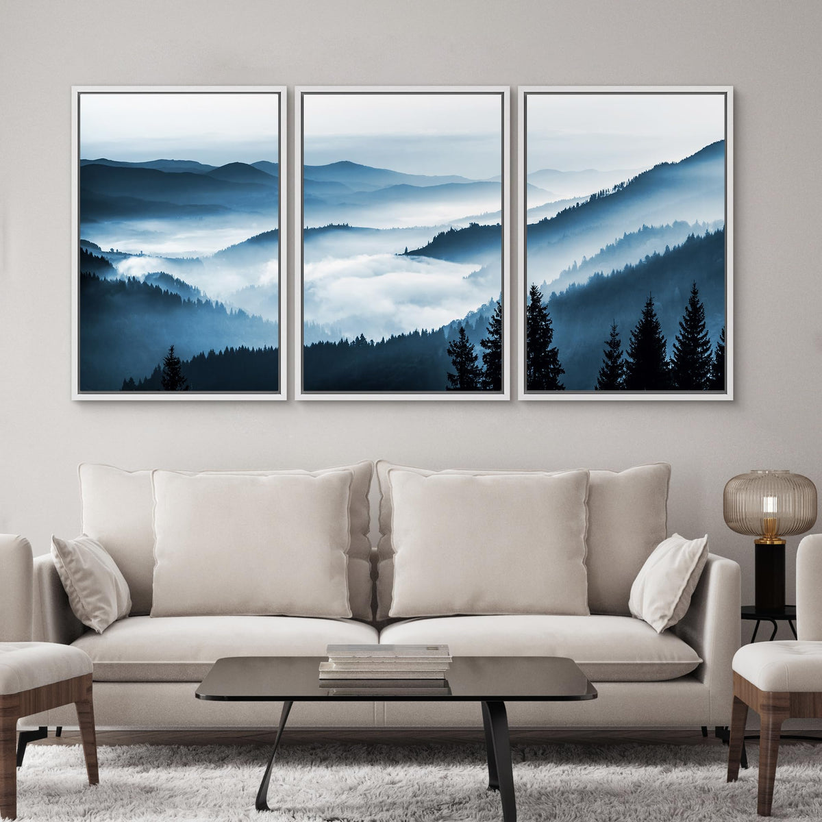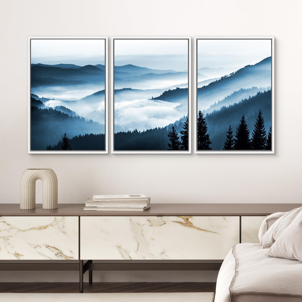 Signwin Framed Canvas Print Wall Art Set Misty Blue Duotone Mountain Range Forest Nature Wilderness Photography Modern Decorativ
