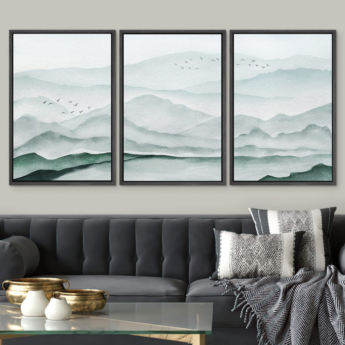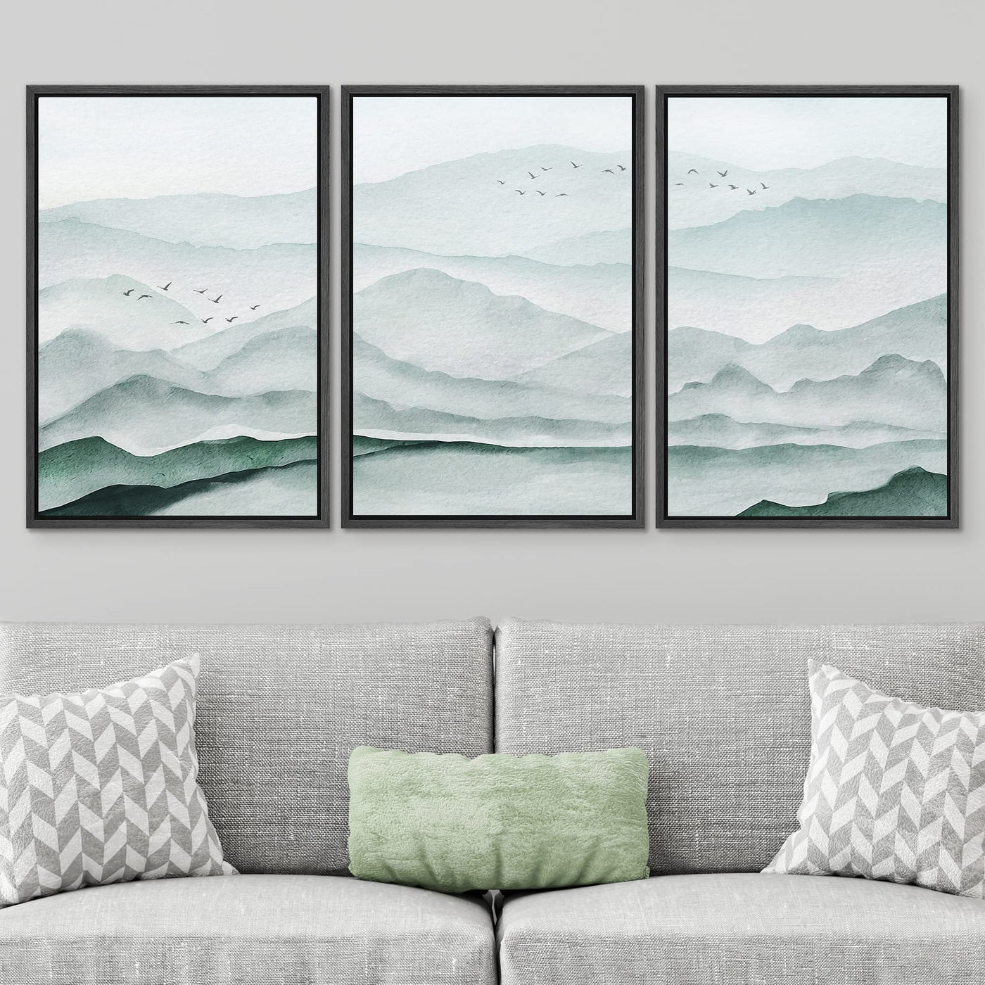 Signwin Framed Canvas Print Wall Art Set Teal Misty Mountain Range Bird Sky Nature Wilderness Illustrations Modern Art Decorativ