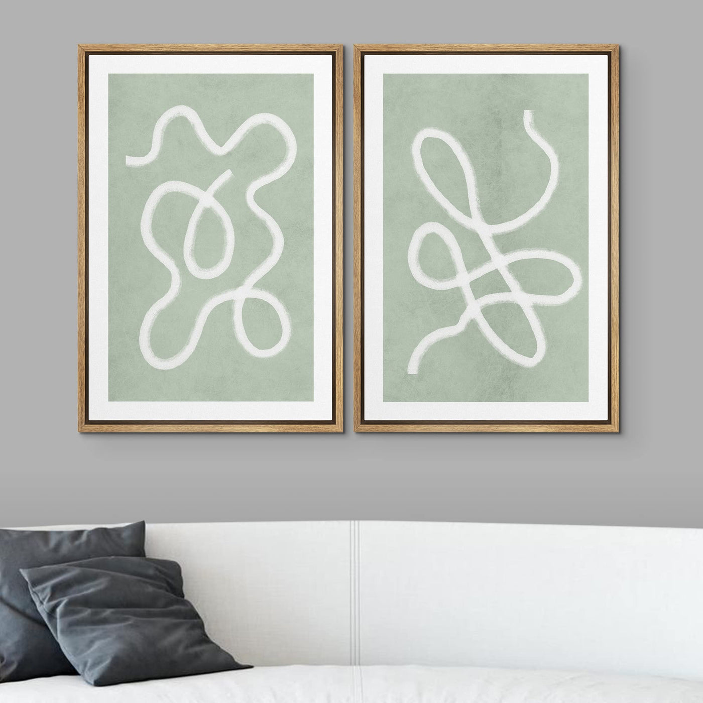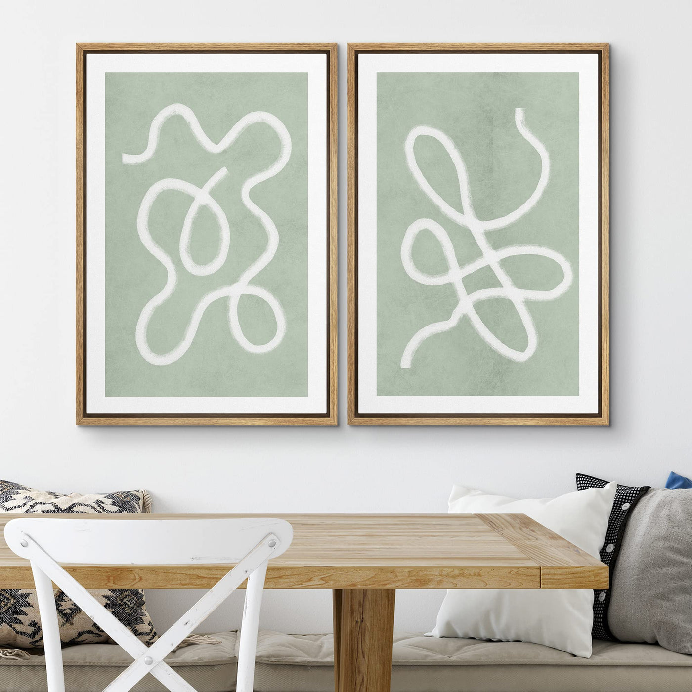 SIGNWIN Framed Wall Art Print Set White Line Over Contrasting Green Background Abstract Swirly Digital Art Modern Art Mid-Century Modern Expressive for Living Room Bedroom Office - 24''x36''x2 Panels