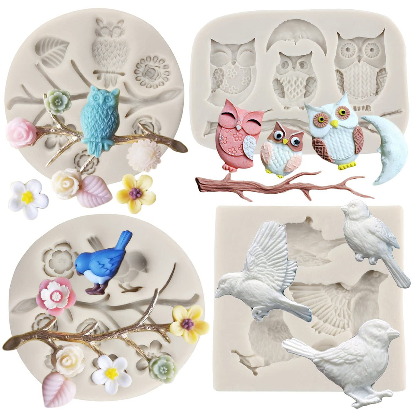 - Q: How many molds are included in the set? A: The set includes a total of 4 silicone molds: 2 Owls molds, 1 Birds mold, and 1 Tree Branch Leaves mold.