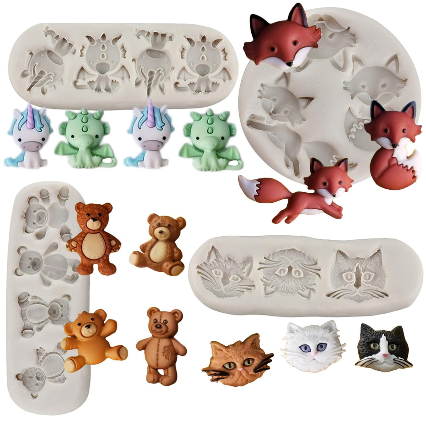 - Q: What is the size of each animal fondant mold in the set? A: The set includes four molds: Bear (3.74*1.38 inches), Unicorn (3.82*1.50 inches), Fox (2.05*2.05 inches), and Cat Head (3.90*1.34 inches).