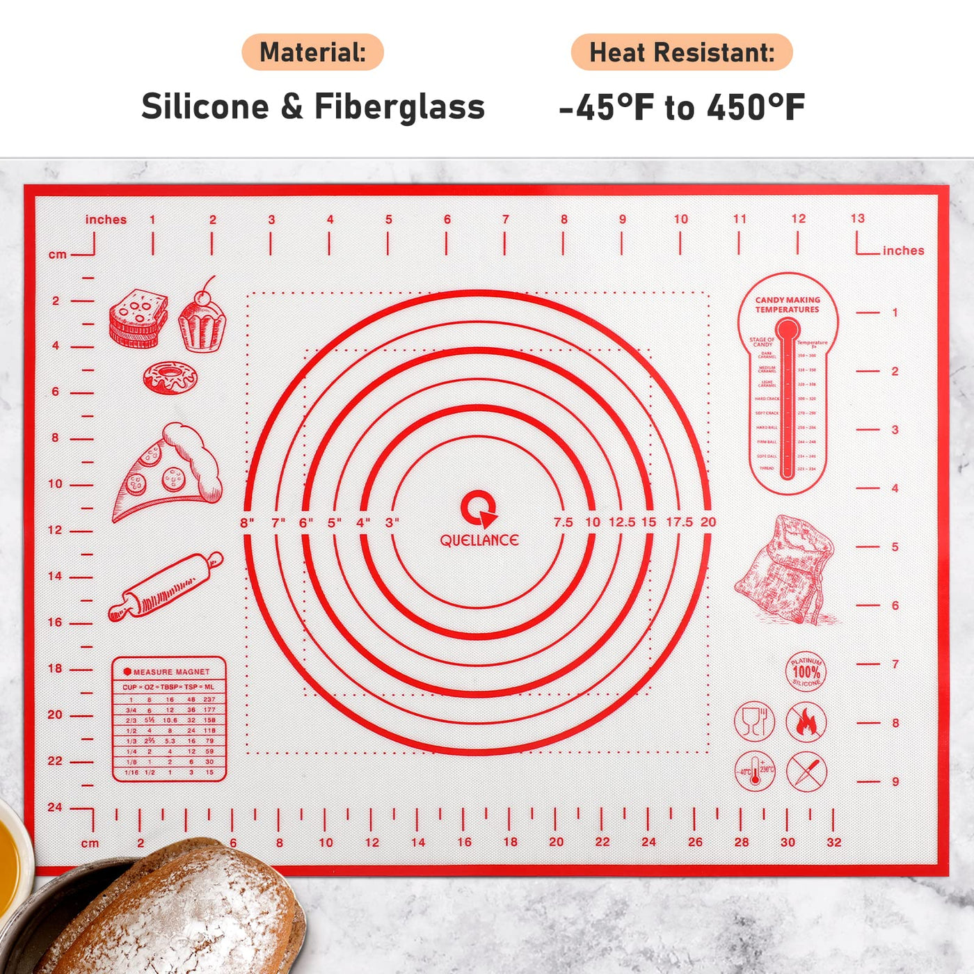 • Q: Can I use the mat for high-temperature baking? A: Absolutely! The silicone pastry mat can withstand temperatures ranging from minus 45 degrees Fahrenheit to 450 degrees Fahrenheit.