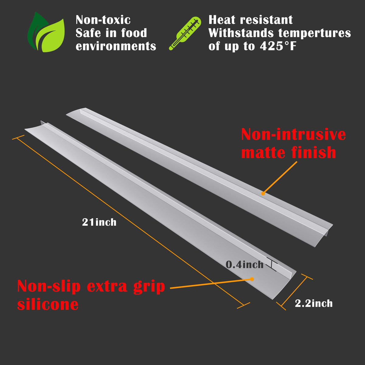 - Q: What is the size of the silicone stove counter gap cover? A: The silicone stove counter gap cover measures 21 inches long, 0.5 inches wide, and 2.25 inches high, making it suitable for gaps between 0.2 to 1.3 inches wide.