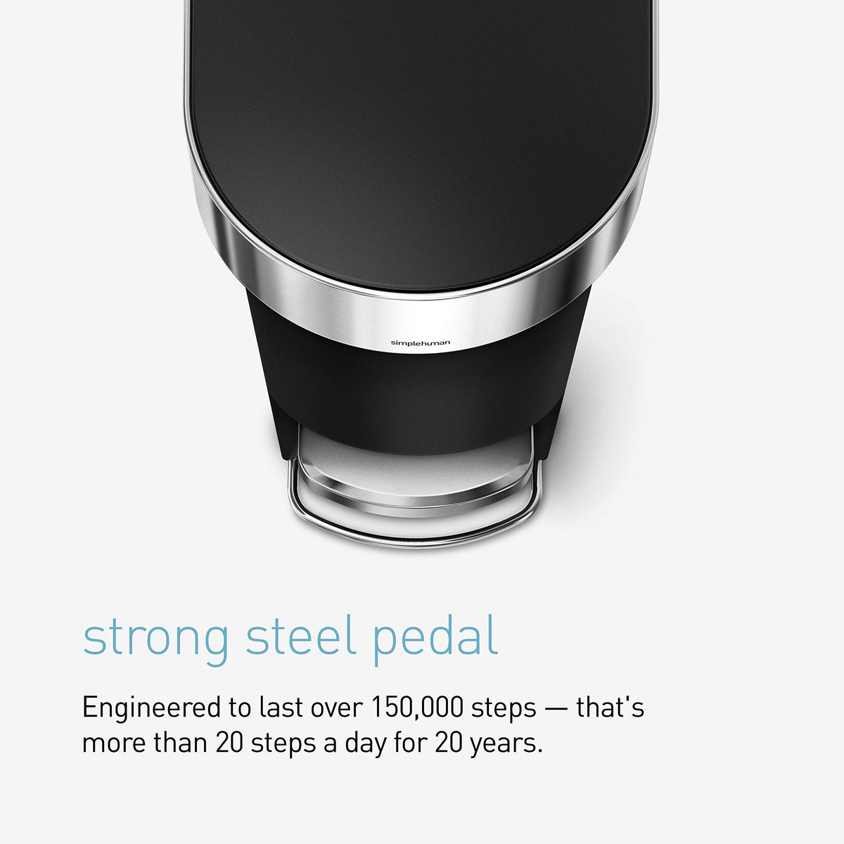 • Q: How durable is the pedal on the simplehuman trash can? A: The strong steel pedal is engineered to last over 150,000 steps, which is more than 20 steps a day for 20 years.