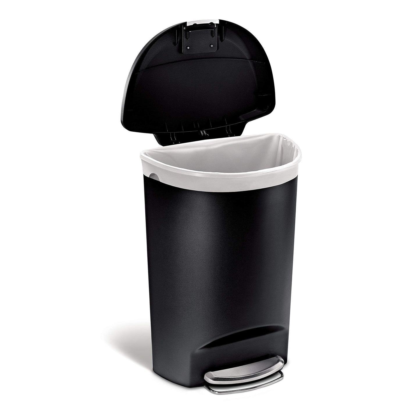 • Q: What materials is the trash can made from? A: The simplehuman semi-round kitchen trash can is made from durable black plastic.