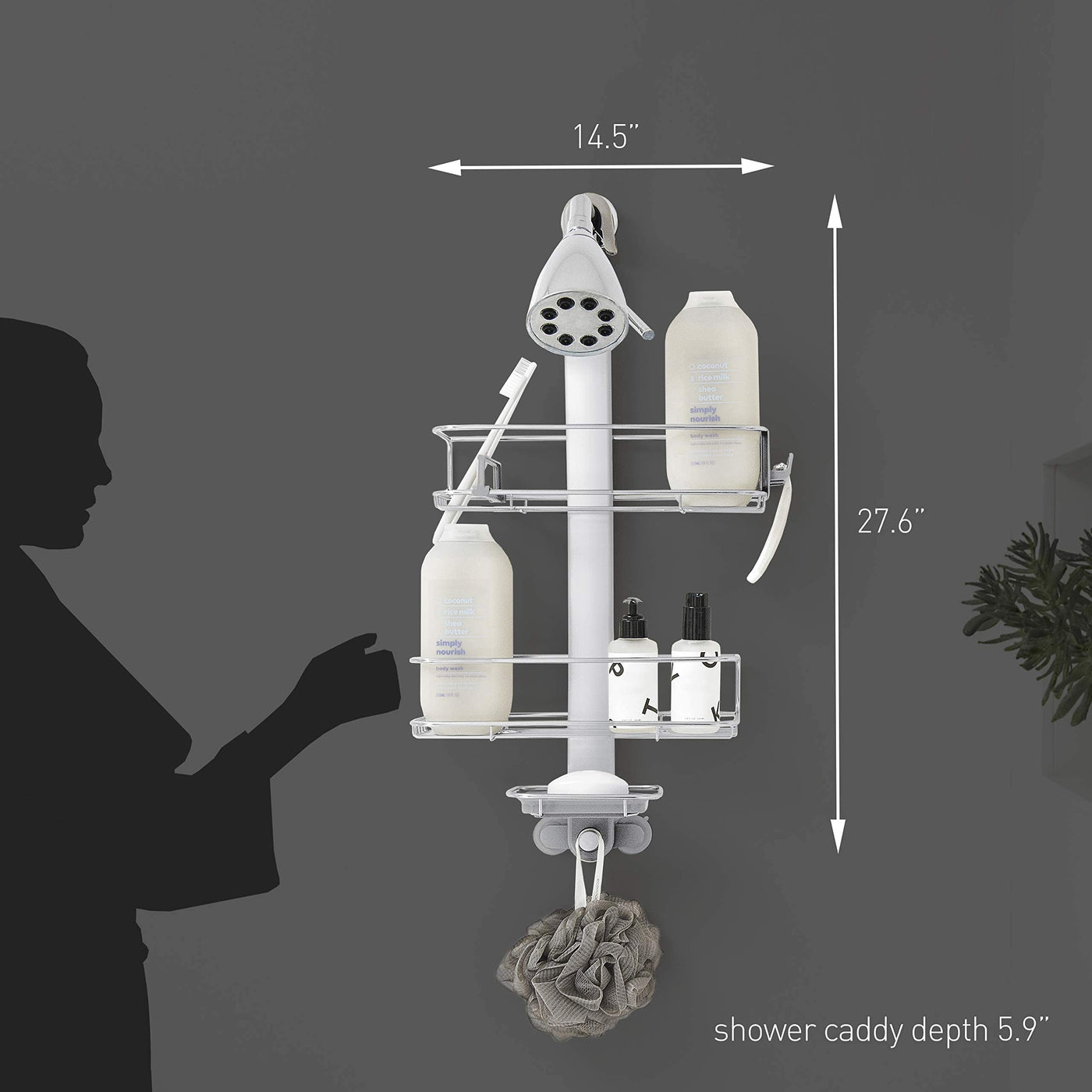 • Q: What accessories can I hang on the simplehuman Shower Caddy? A: The caddy includes convenient storage hooks that can hold a variety of accessories such as razors, loofahs, or other grooming tools.