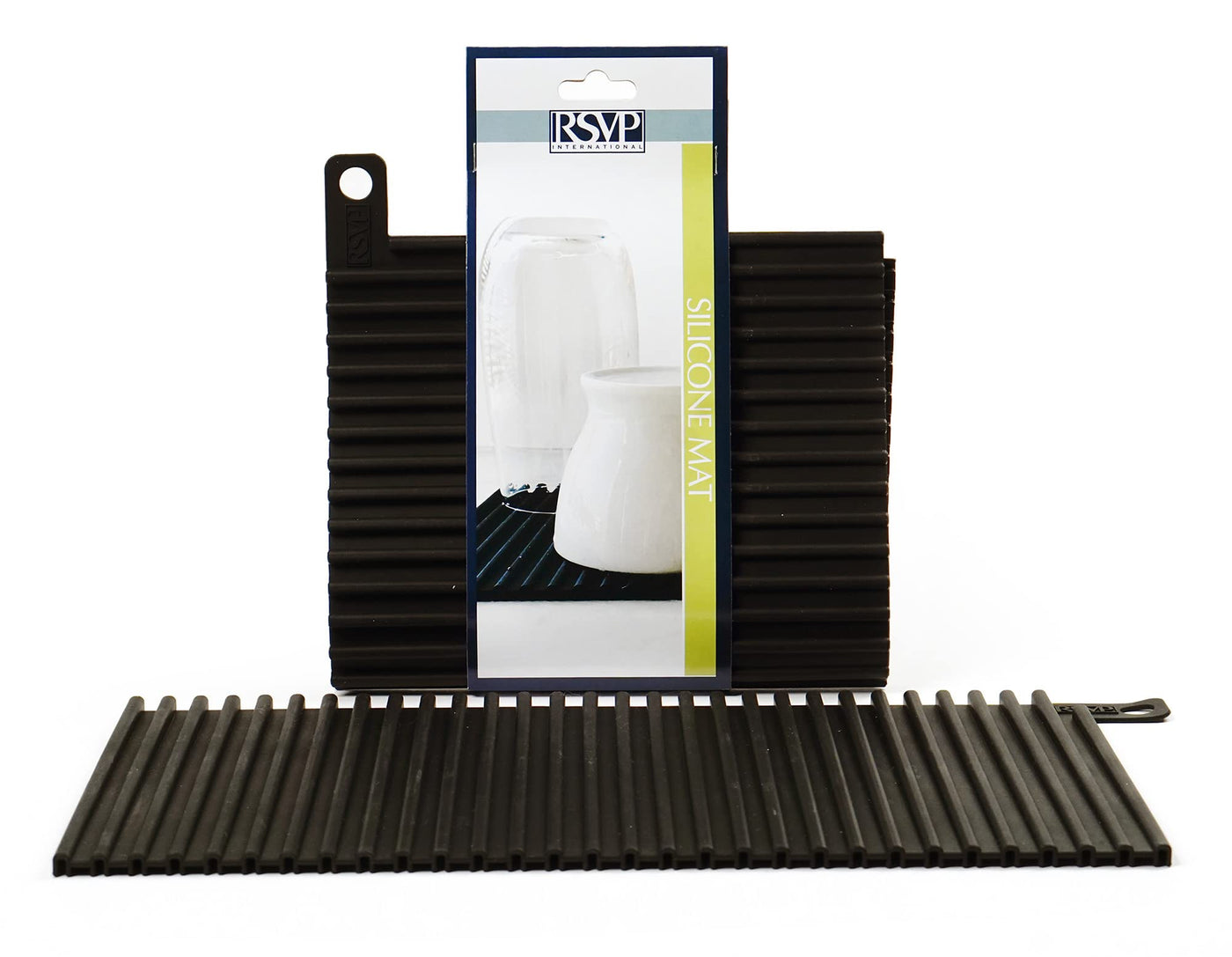 • Q: What is the size of the RSVP International Silicone Dual Use Sink Mat/Hot Pad? A: The mat measures 12 inches long and 7 inches wide.