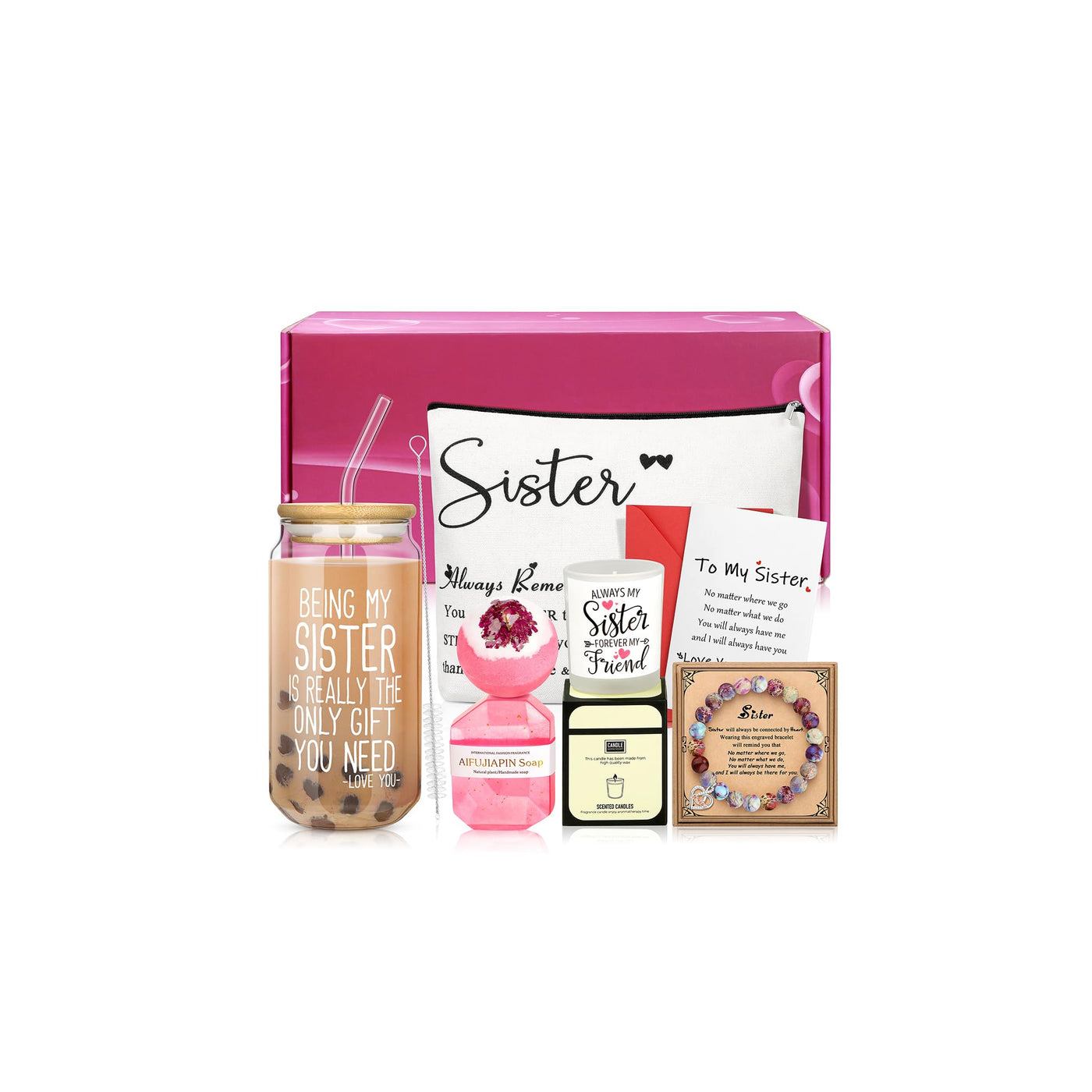 - Q: What items are included in the Sister Gift Set? A: The Sister Gift Set contains a 16 Oz can glass with lid and straw, a makeup bag, a soy wax Lavender scented candle, a pure handmade soap, a bath bomb, a heartfelt greeting card, and a unique Colorful Imperial natural stone bracelet.