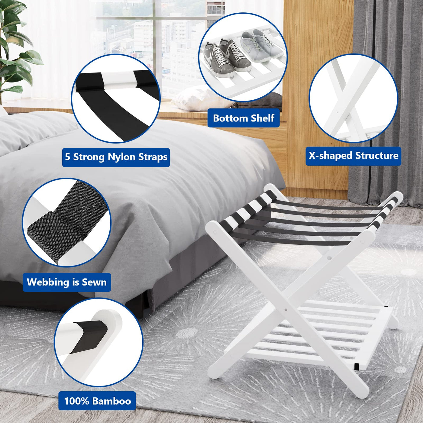 Smuxee Fully Assembled White Luggage Rack, Upgraded Bamboo Foldable Suitcase Stand With 5 Nylon Straps, Luggage Holder With Shel