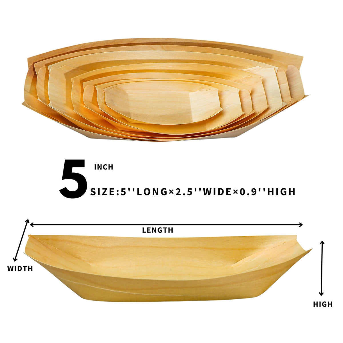 - Q: What are the dimensions of the Snowkingdom disposable wood boat plates? A: The Snowkingdom disposable wood boat plates measure 5 inches long, 2.5 inches wide, and 0.9 inches high.