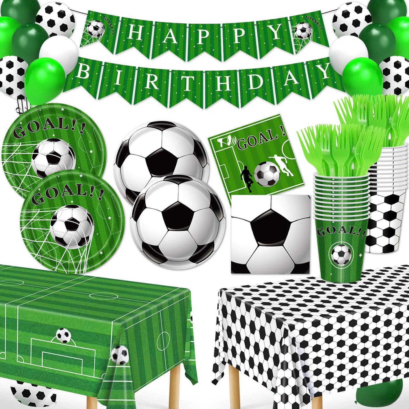 - Q: What items are included in this soccer party decoration set? A: The set includes 24 9-inch plates, 24 7-inch plates, 24 forks, 24 napkins, 24 cups, 1 soccer happy birthday banner, 20 balloons, and 2 soccer party tablecloths (137x274 cm).