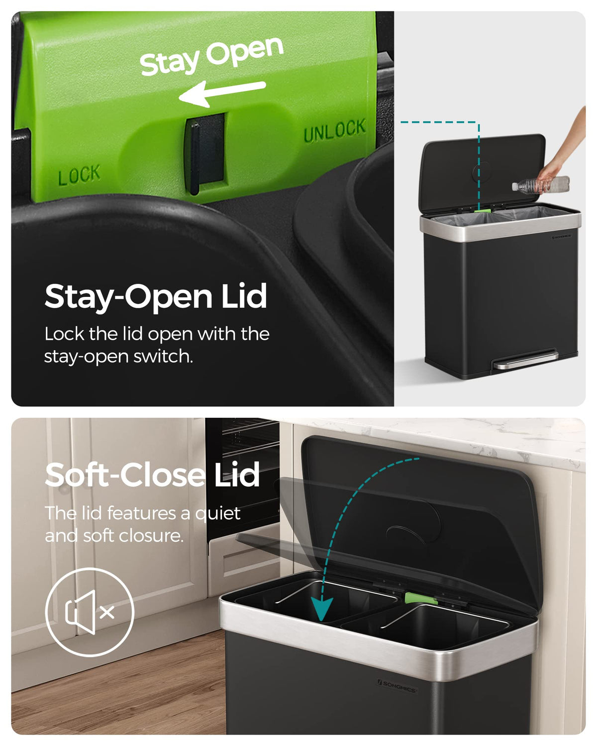 SONGMICS Kitchen Trash Can 16 Gallon (2 x 8 Gallon) Dual Compartment Garbage Can 60L Pedal Recycling Bin Stay-Open Lid and Soft Closure Stainless Steel 15 Trash Bags Included Black ULTB202B01