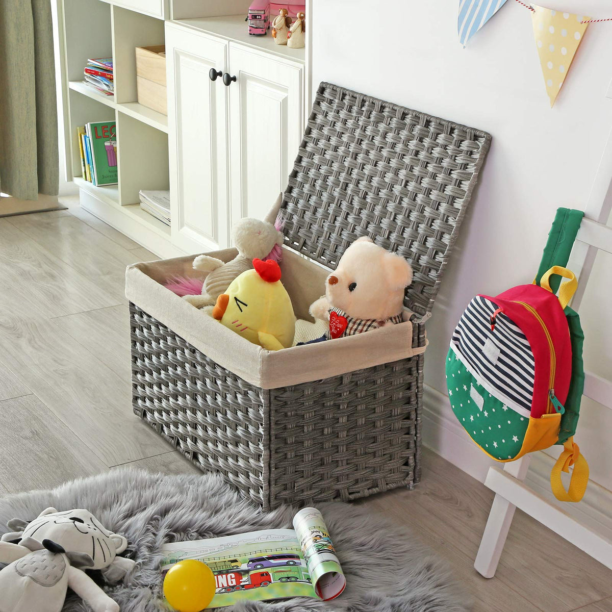 SONGMICS Storage Basket with Lid Rattan-Style Storage Trunk with Cotton Liner and Handles for Bedroom Closet Laundry Room 21.9 x 13.4 x 13.4 Inches Gray URST56WG