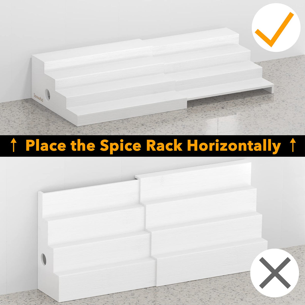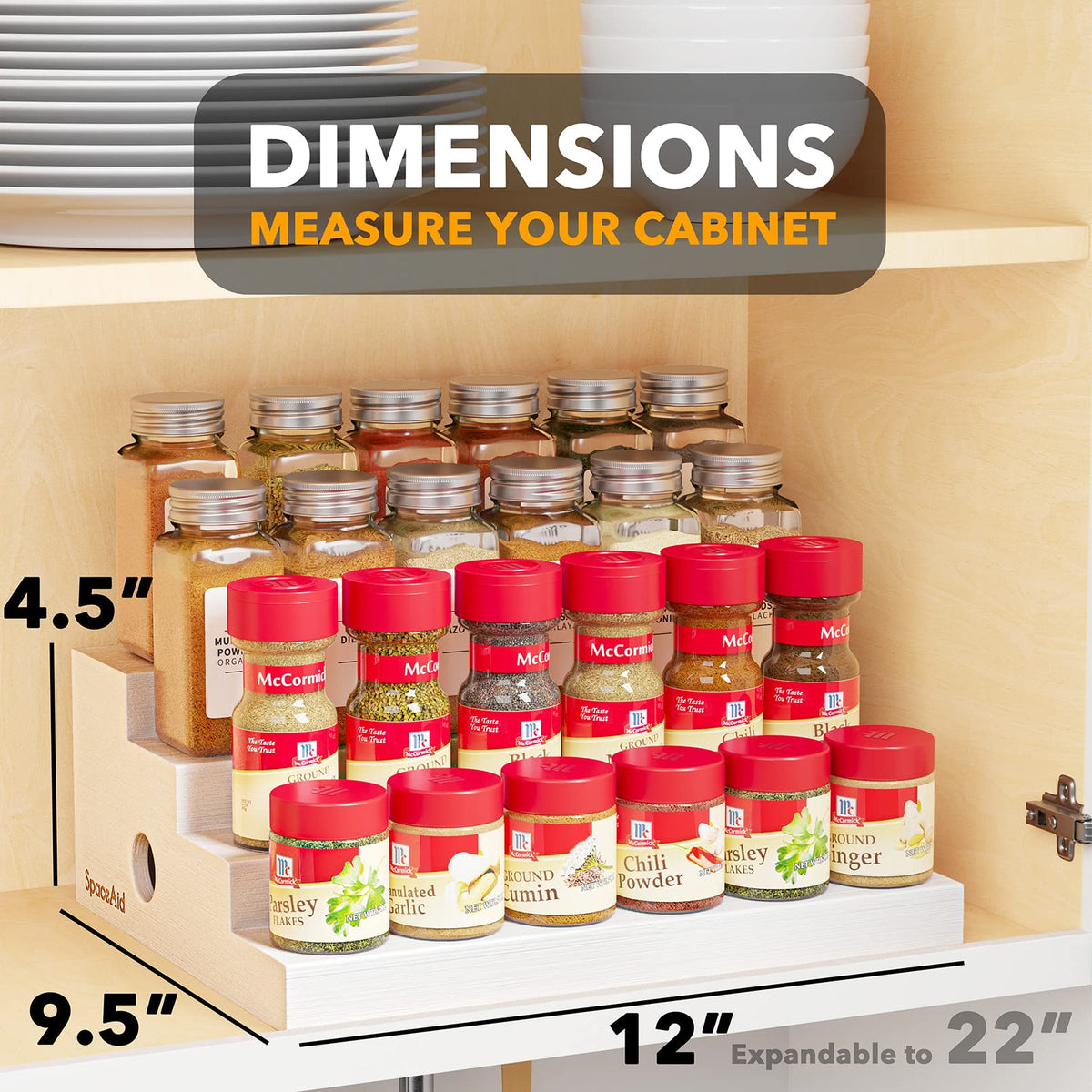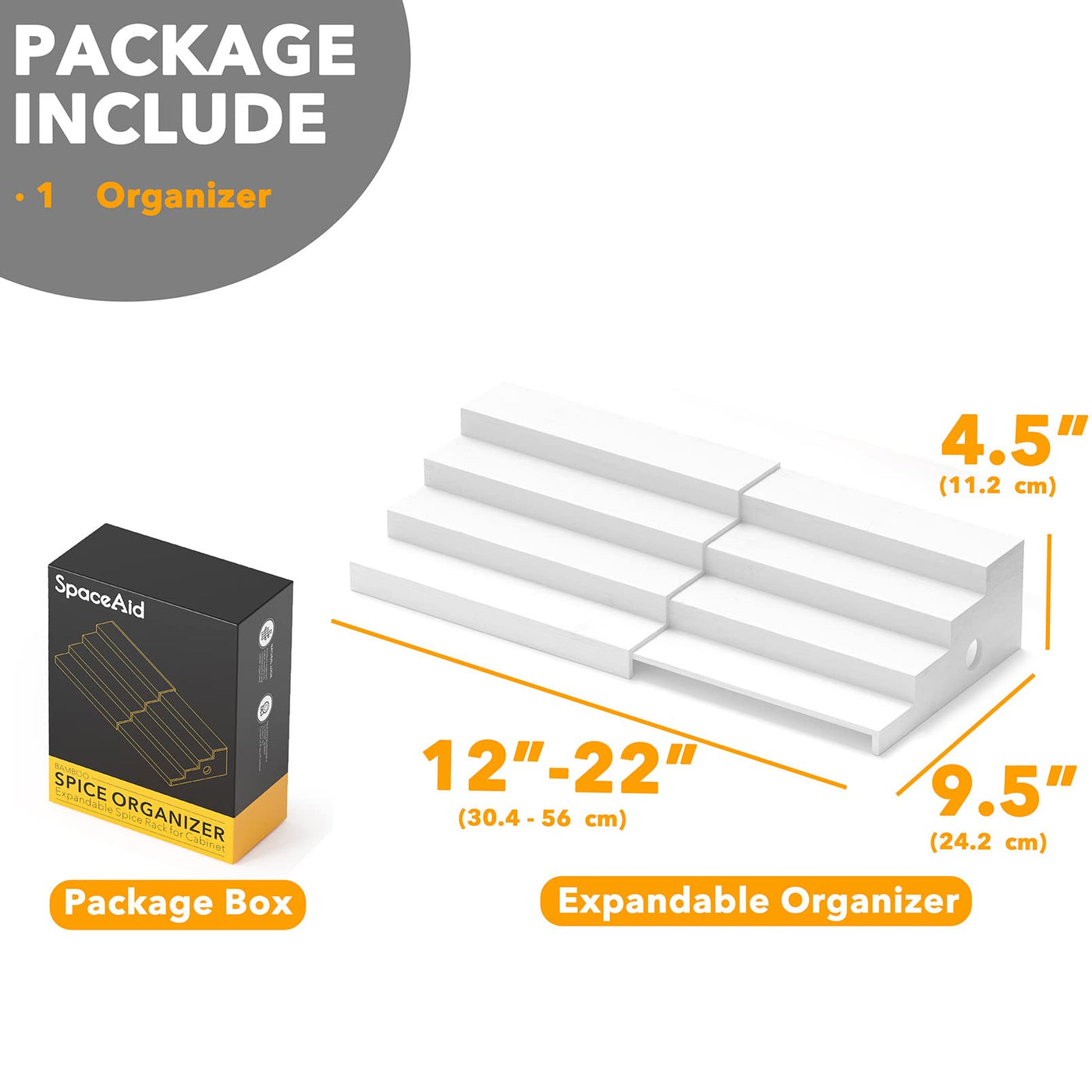 - Q: What are the dimensions of the spice rack when fully expanded? A: The spice rack can be adjusted from 12 inches to 22 inches wide, with a depth of 9.5 inches and a height of 4.5 inches.