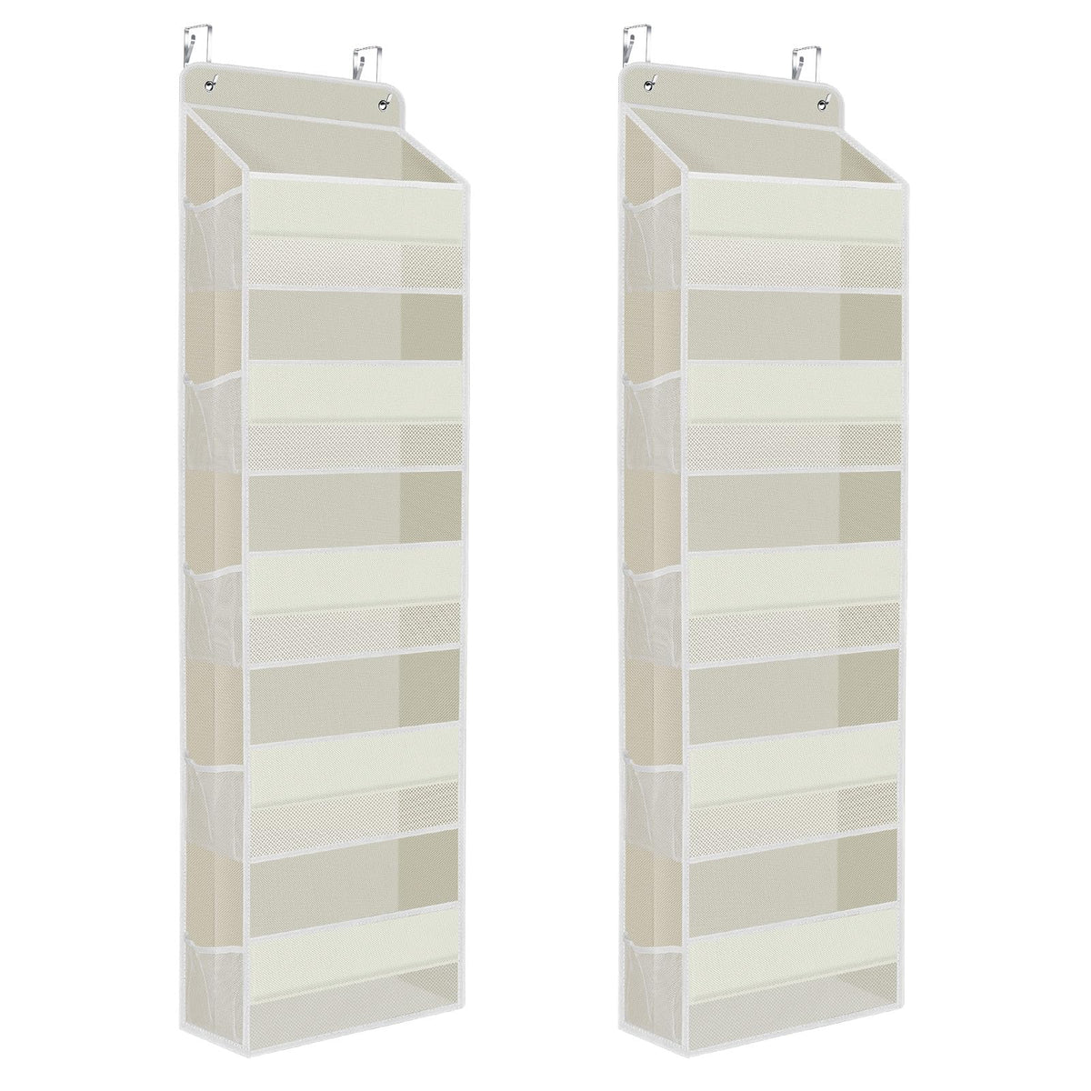 AMPLE STORAGE SPACE: 2 pack 5-tier bedroom storage measures 52.3x 13.8x 5.5. Features 5 roomy pockets and 10 mesh side pockets. The see-through mesh on each pocket ensures you find what you need effortlessly40LBS LOAD CAPACITY: our door organizer built-in strengthened side cardboard to prevent tilting. Additionally, strongly reinforced bottom cardboard so that it won't warp even when loaded with up to 40 lbsEASY TO INSTALL: first attach the hooks over the door, then hang the room organizer from the hooks, then insert the cardboard into the bottom and finally put items into the storageEFFICIENT SPACE UTILIZATION: our door hanging organizer maximizes utilization of vertical space behind doors, and doesn't take floor space. providing 2 sturdy metal hooks, and fit most doors (within 1.65 inches), sitting flush to the door without hindering closingVERSATILE USAGE: Fits kid's rooms, nursery, bedrooms, bathrooms, pantry, closet, laundry, kitchen and other areas where you need to store. you can organize your possessions efficiently, to keep everything organized in the room