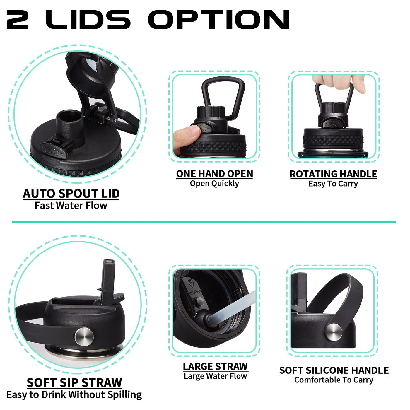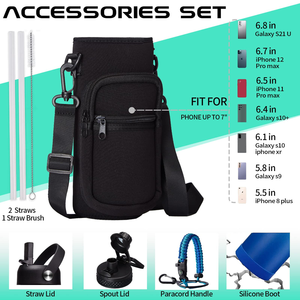 - Q: Does the water bottle come with any accessories? A: Yes, it includes straw and spout lids, a paracord handle, a strap sleeve, and a protective cup mat.