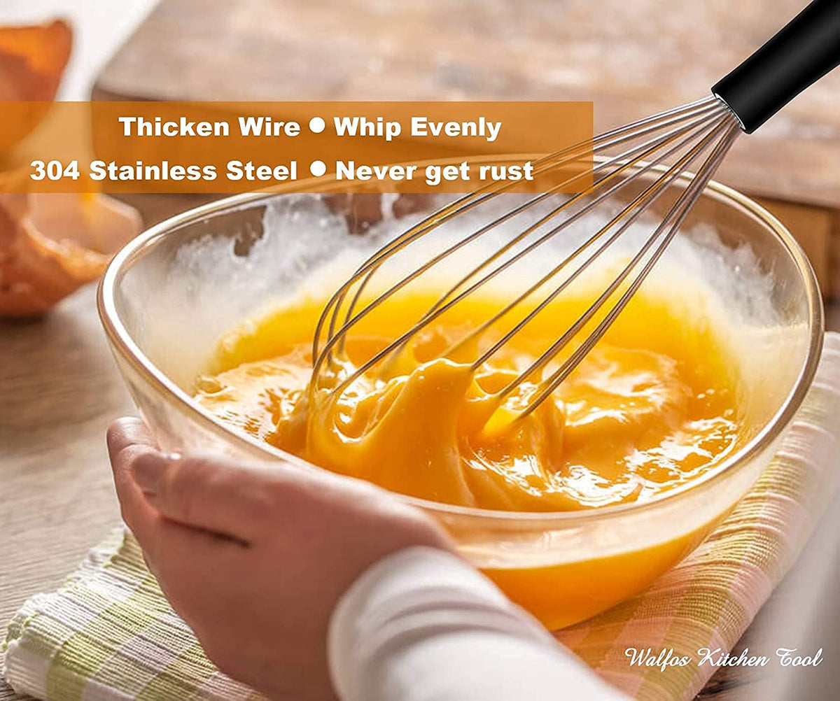 - Q: Can the WALFOS whisks be used for thick mixtures like dough? A: While the whisks are designed for various tasks, they are most effective for lighter mixtures such as eggs and sauces rather than dense dough.