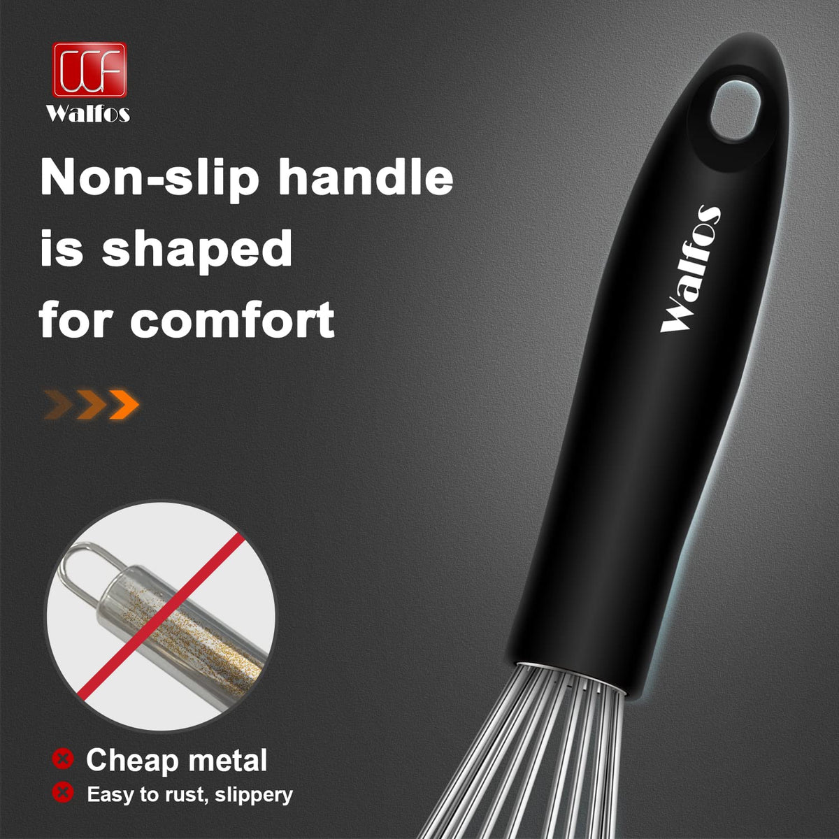 - Q: What are the features of the handles on these whisks? A: The whisks feature ergonomic handles that are designed to provide a comfortable grip. The unique 5-inch long handle helps improve control and balance during use.