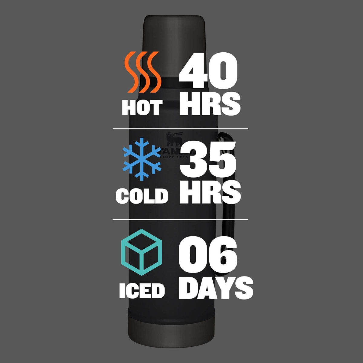 - Q: What sizes does the Stanley Classic Vacuum Bottle come in? A: The thermos is available in multiple sizes: 1.1 quart, 1.5 quart, and 2 quart.