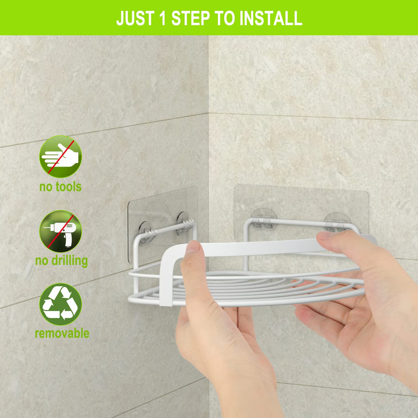 • Q: How do I install the corner shower shelves? A: To install the corner shower shelves, first clean the wall and keep it dry. Measure the desired location for the stickers and mark it. Remove the film from the adhesive and apply it at the marked position, pressing hard to remove any bubbles.