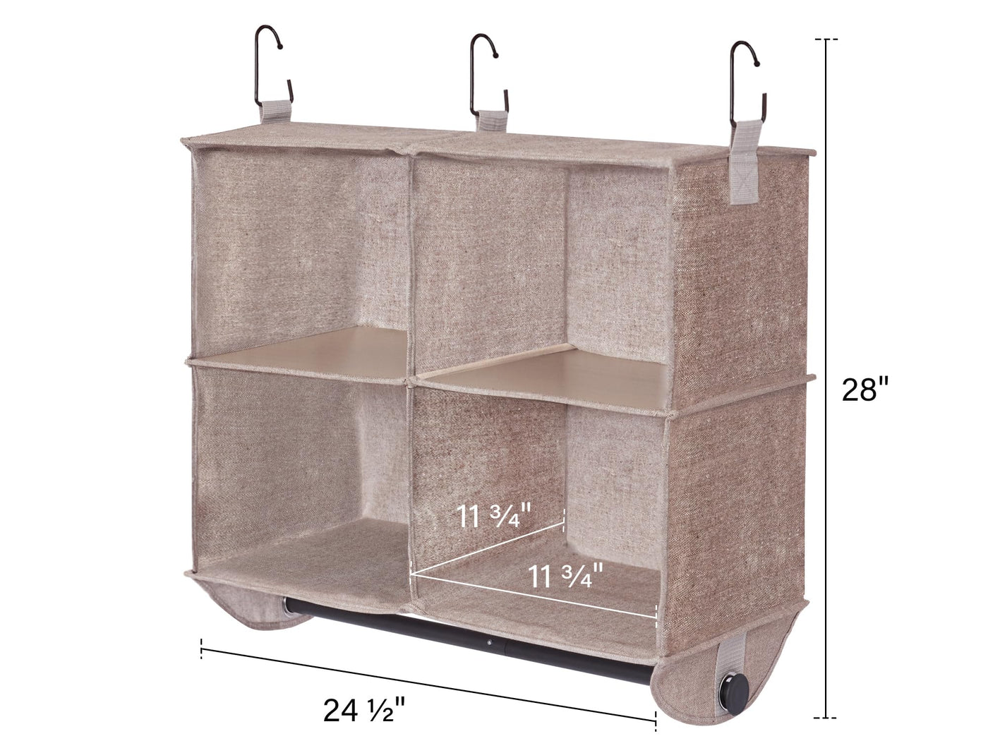 - Q: What are the dimensions of the StorageWorks Hanging Closet Organizer? A: The dimensions of the StorageWorks Hanging Closet Organizer are 12 ¼" D x 24 ½" W x 28" H.
