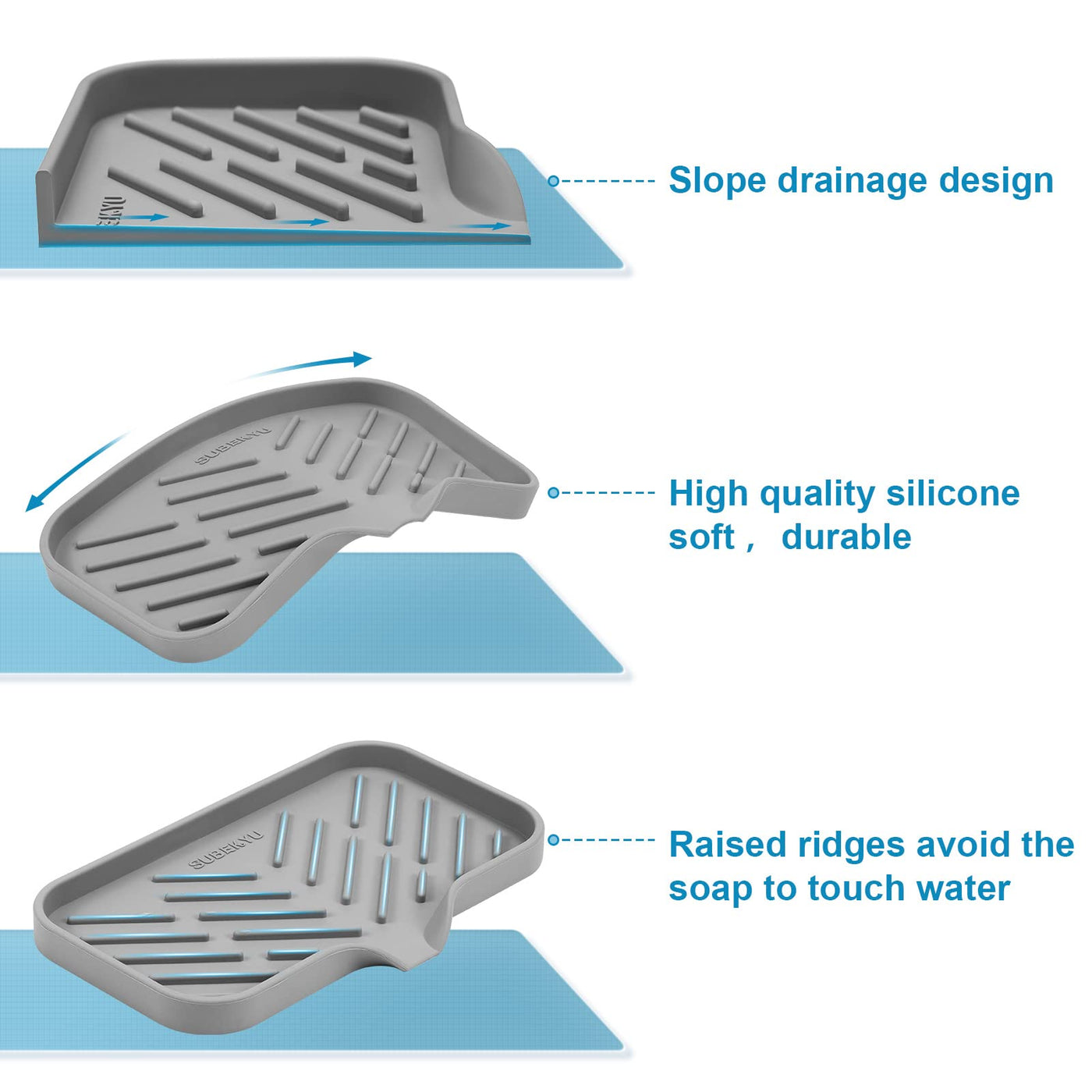 - Q: What color is the SUBEKYU Silicone Kitchen Soap Tray? A: The soap tray is available in a grey color.