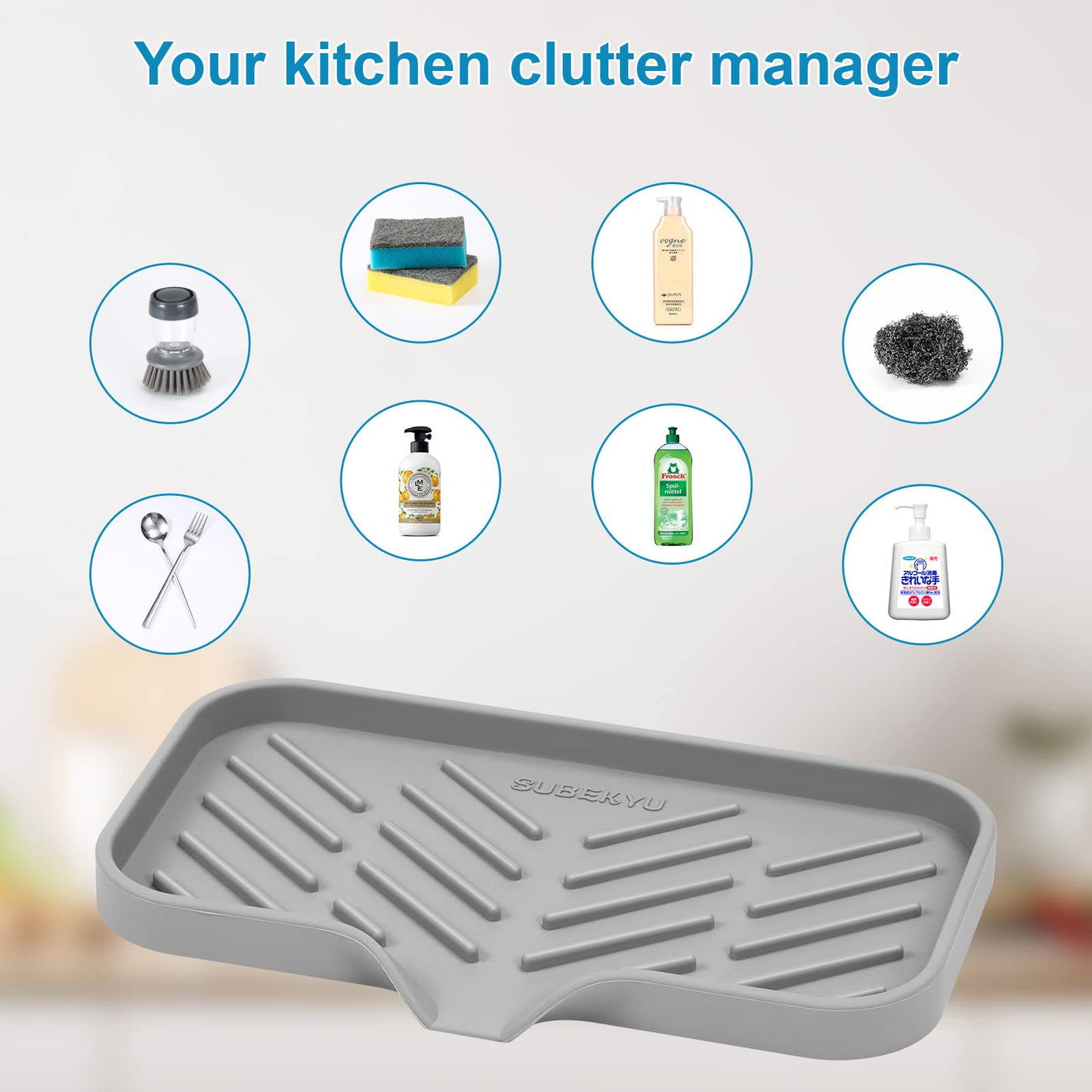 Subekyu Silicone Kitchen Soap Tray, Sink Tray For Kitchen Counter/Soap Bottles, Sponge Holder And Organizer With Drain Spout, Gr