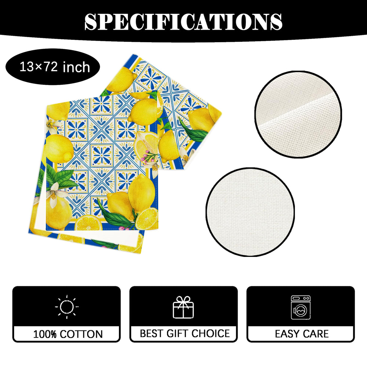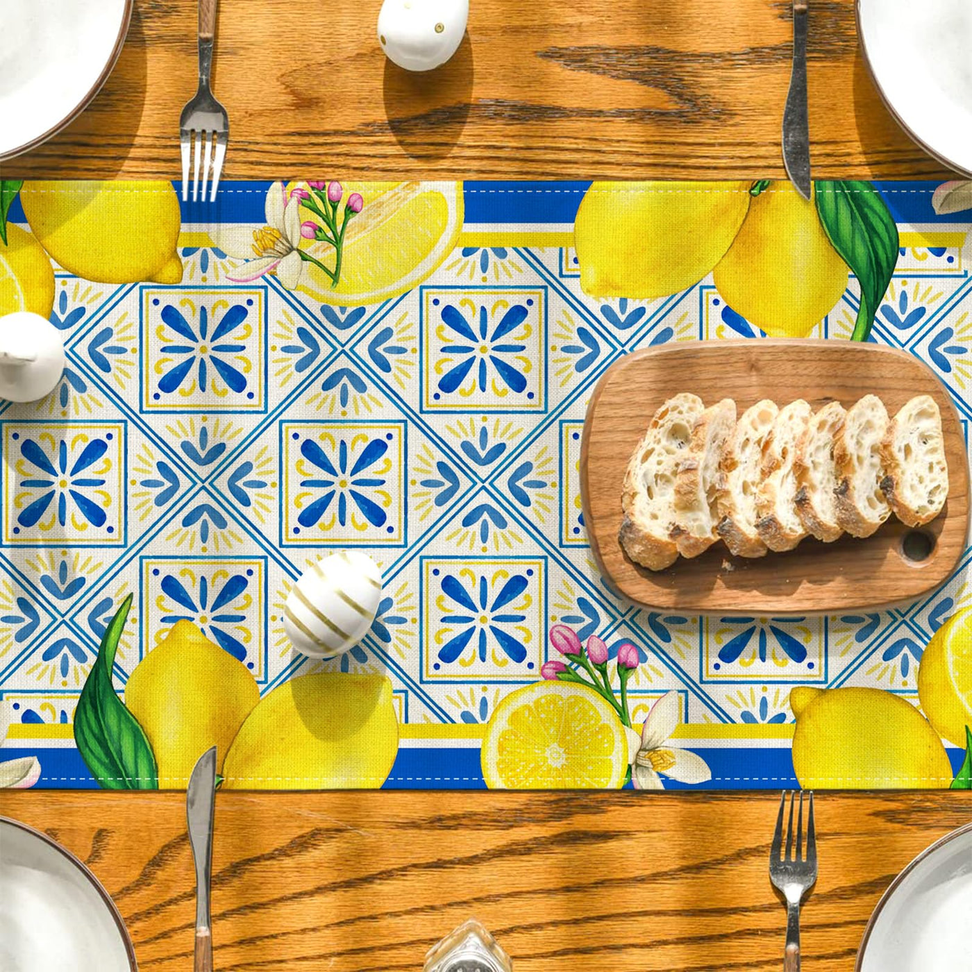 Summer Lemon Table Runner Spring Italian Lemons Table Cover Italy Blue Tiles Lemon Decor Cyan-Blue Tile Burlap Artificial Lemon