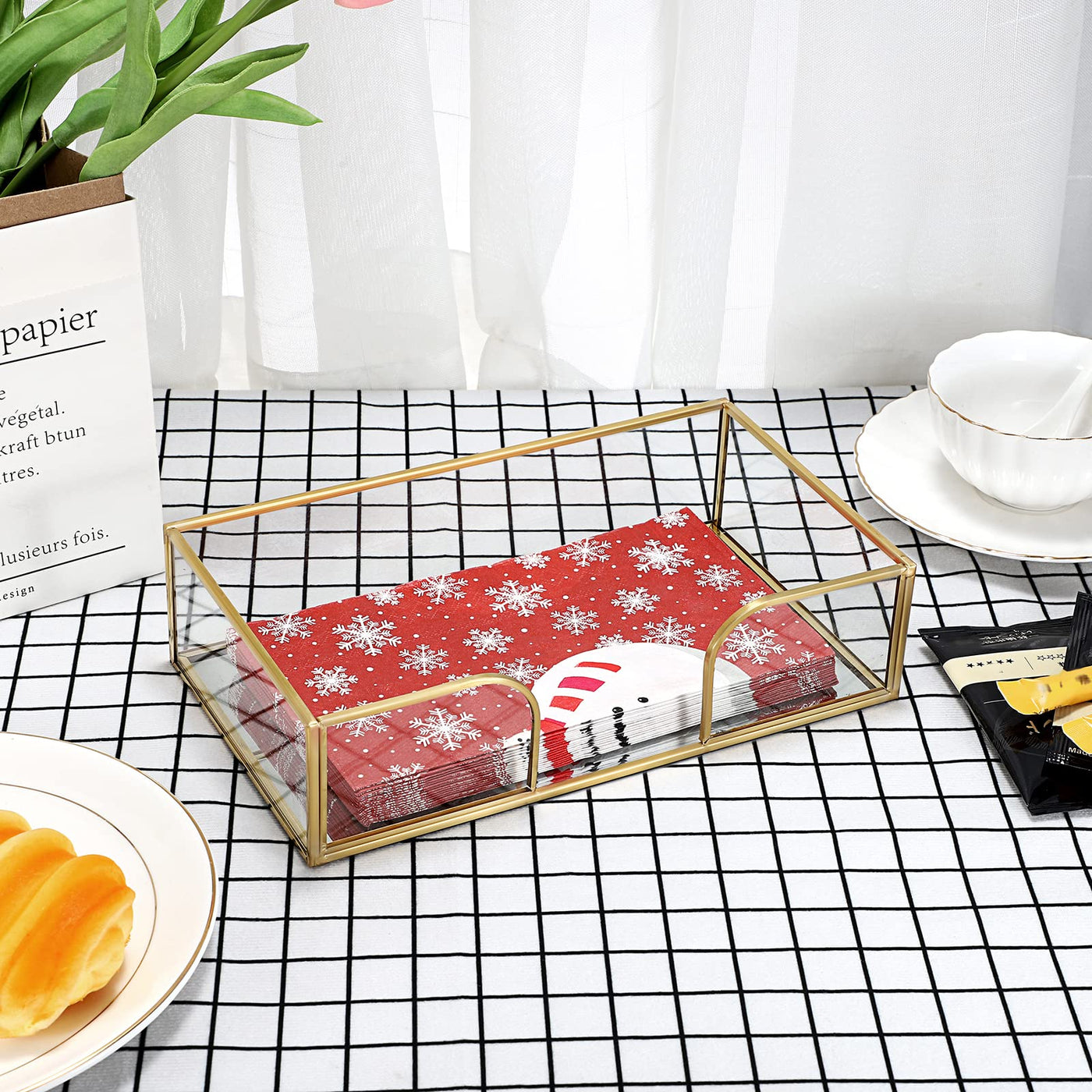 - Q: What materials are used in the construction of this napkin holder? A: The napkin holder is made of sleek glass and premium brass, ensuring sturdy quality and an elegant appearance.