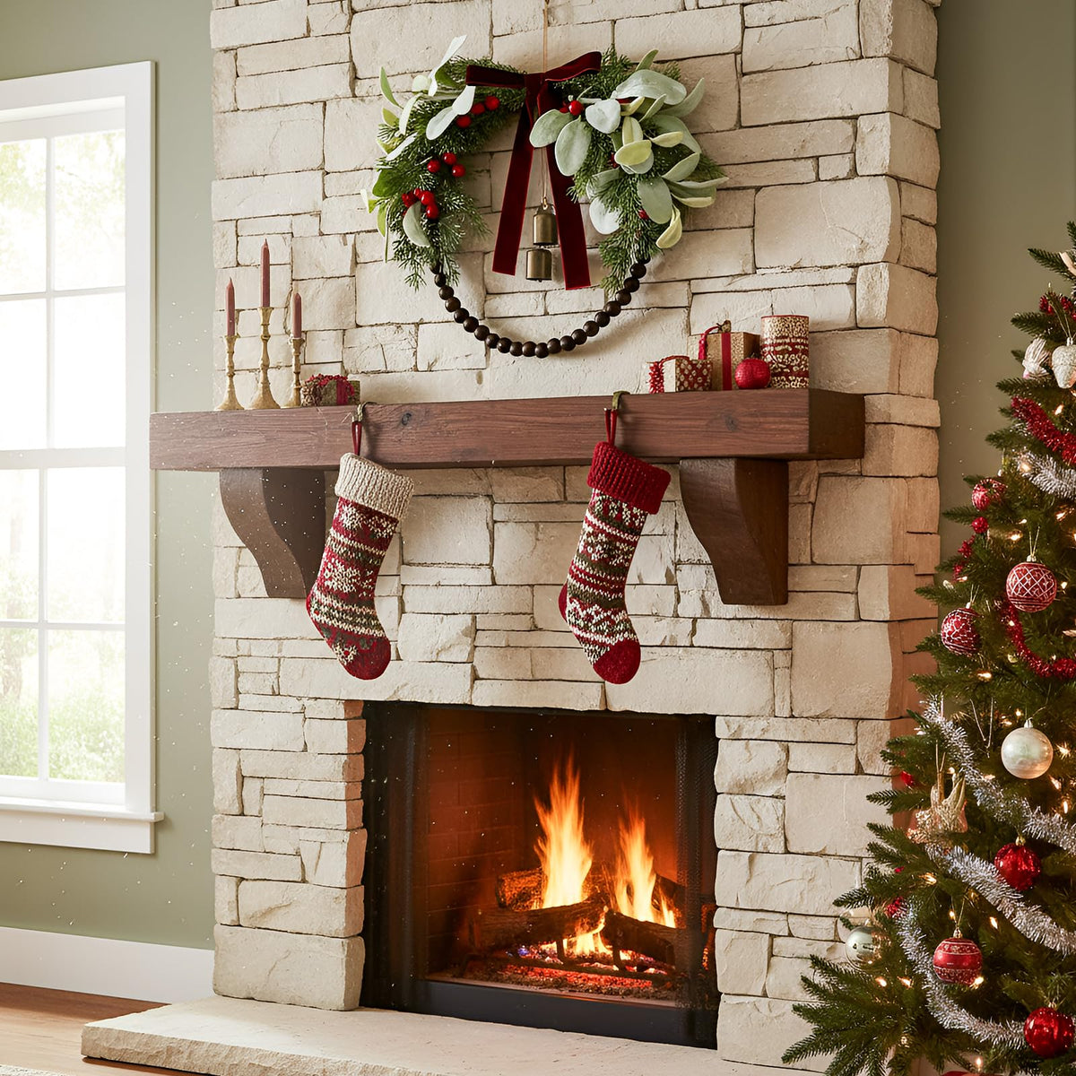Suncalla 12 Inch Olive Norfolk Pine Christmas Wreath with Wooden Bead Bell Christmas Kitchen Cabinet Wreath for Front Door Farmh