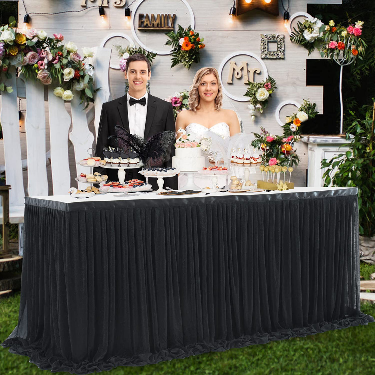 - Q: Does the table skirt come in different colors? A: The listing provided is specifically for a black tulle table skirt; any additional colors would need to be confirmed with the seller.