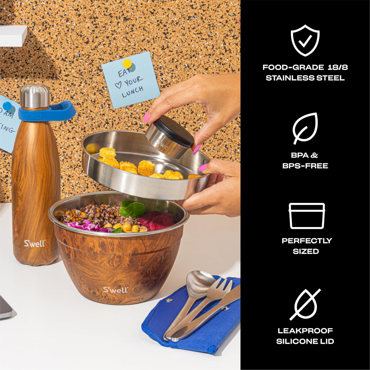 • Q: What materials are used in the S'well Stainless Steel Condiment Container Set? A: The S'well Condiment Container Set is made of high-grade 18/8 stainless steel and features silicone leak-proof lids. It is BPA and BPS-free.