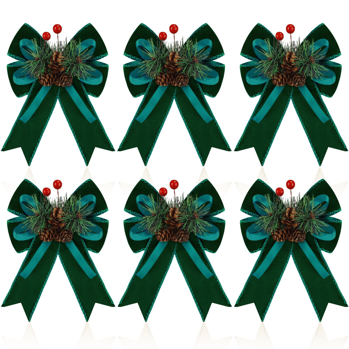 Syhood 6 Pcs Christmas Velvet Bow with Pine Cones Pine Needles Berries Xmas Dark Green Ribbon Bow Ornaments 6.3 x 5.1 Inch for C